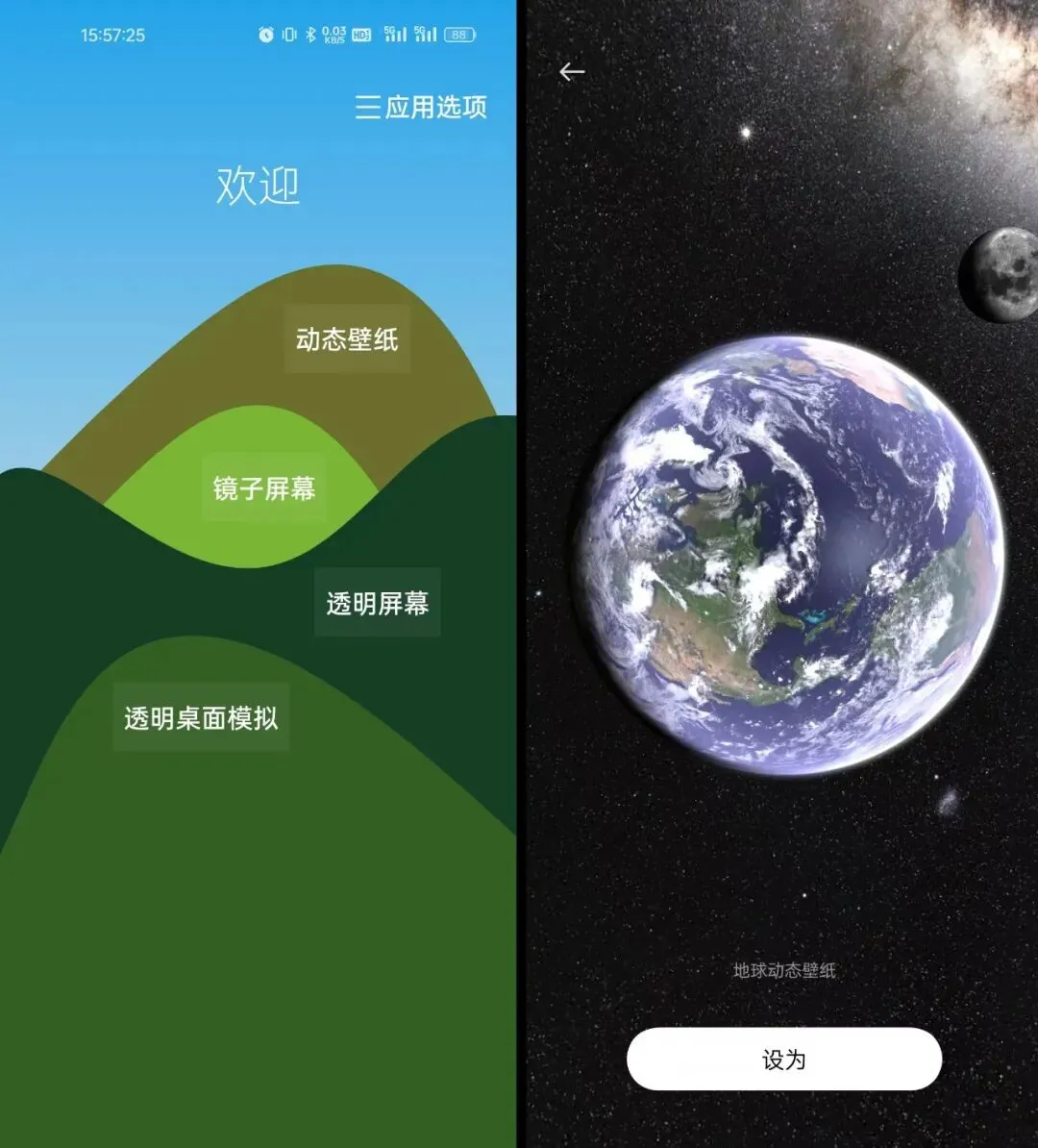 电脑用动态壁纸不少吧,但是手机用动态壁纸的人可就不多了,这个app恰好有,但是只有地球星空的动态壁纸,谁叫他主要功能不是动态壁纸呢。