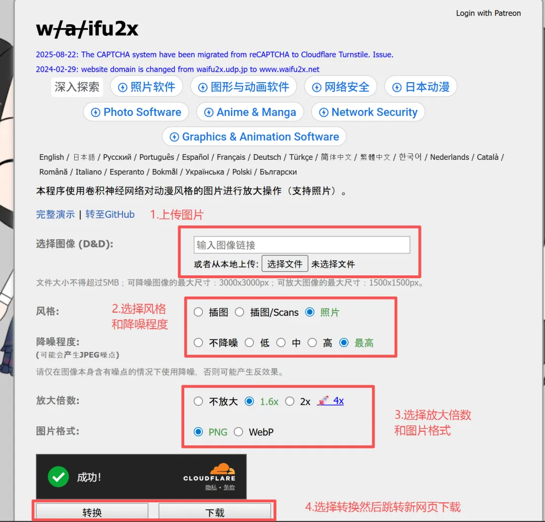 分享给大家一个可以把图像放大和变清晰的网站:waifu2x 连接(https://www.waifu2x.net)