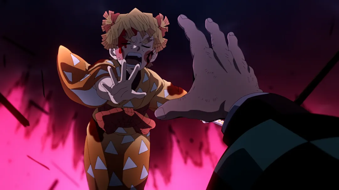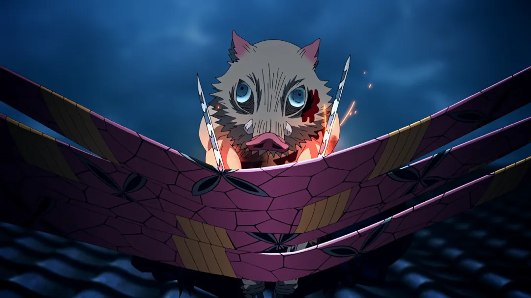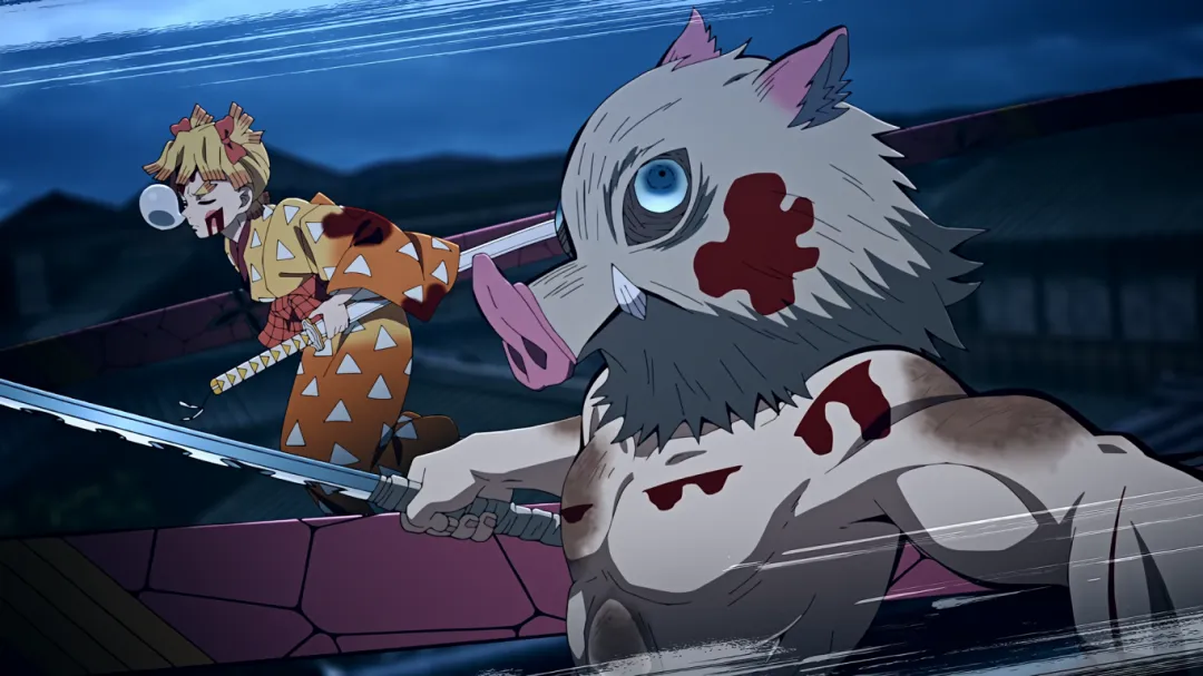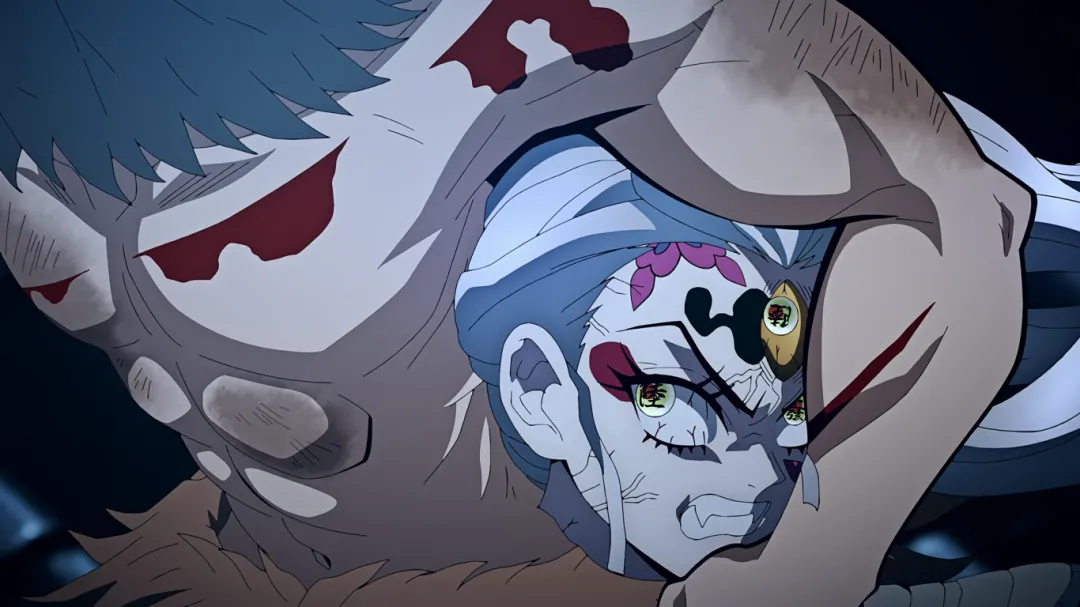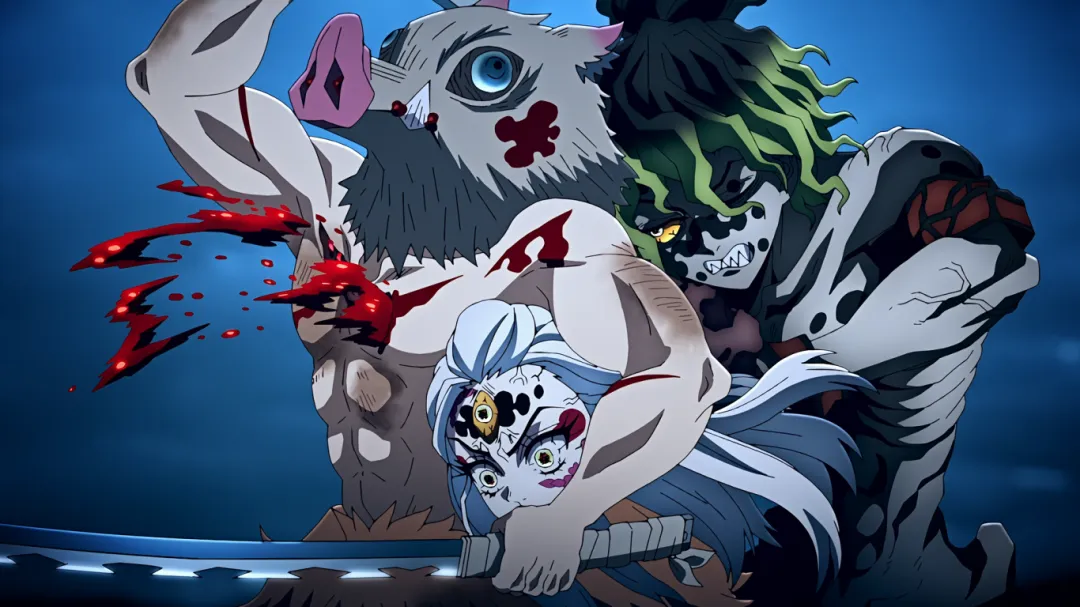 但不成想下一秒,画风突变。妓夫太郎瞬闪镰刀插入了伊之助的心脏;音柱宇髄天元被砍断手倒地不起;善逸为了救炭治郎被房屋瓦砾砸到;炭治郎也身负重伤。