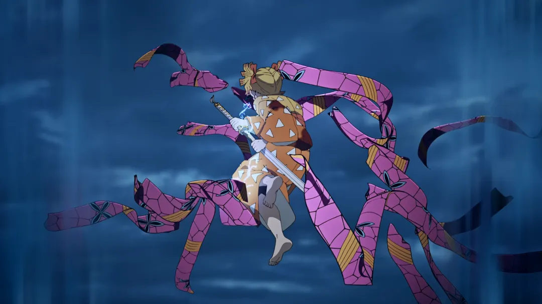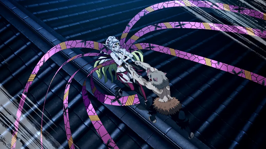 另一边,伊之助和善逸跟堕姬打的难舍难分,一直被绸带牵制近不了身。