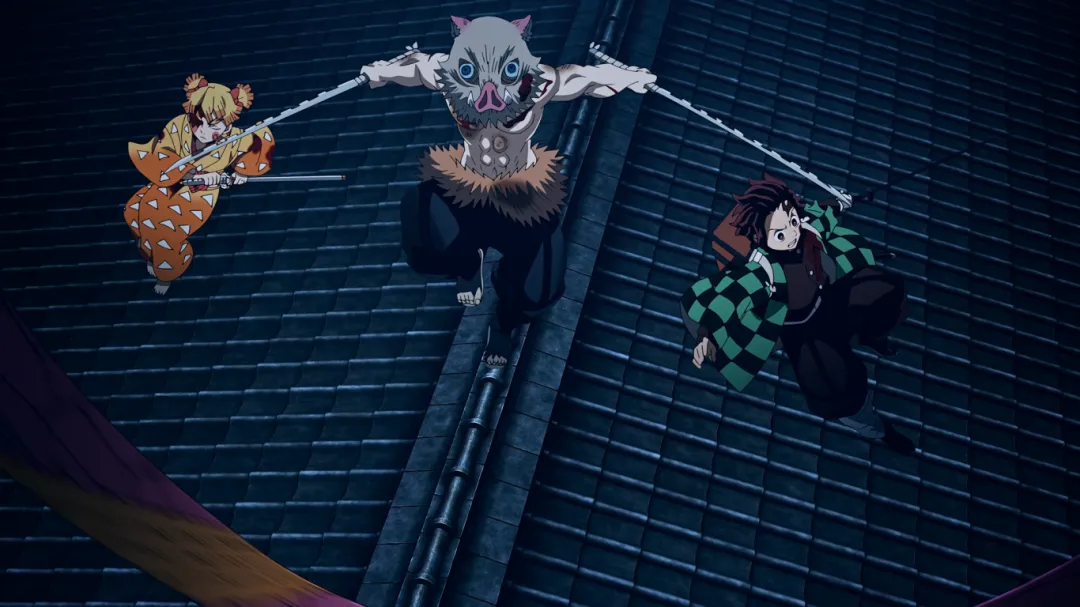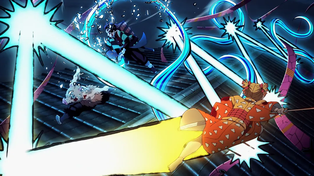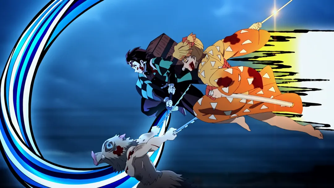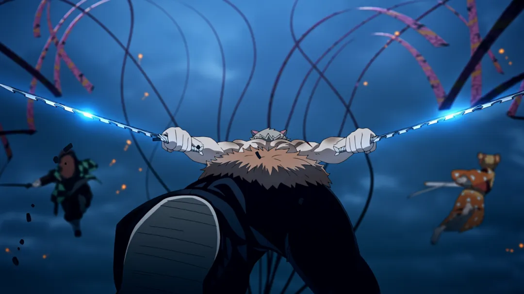 名场面:三小只集合,三人配合各自使出呼吸术进攻,伊之助也是成功砍下堕姬脖子。