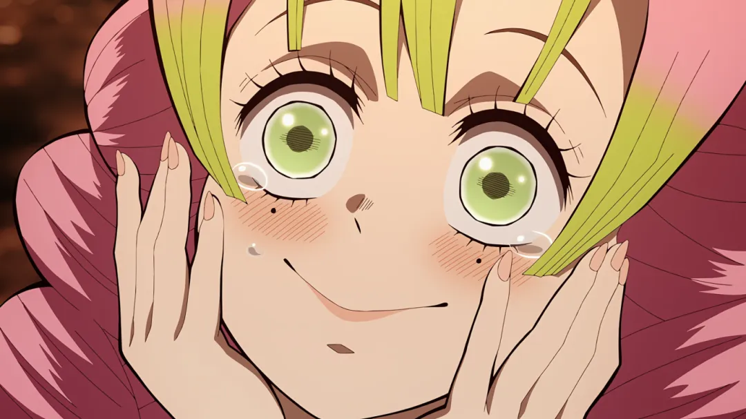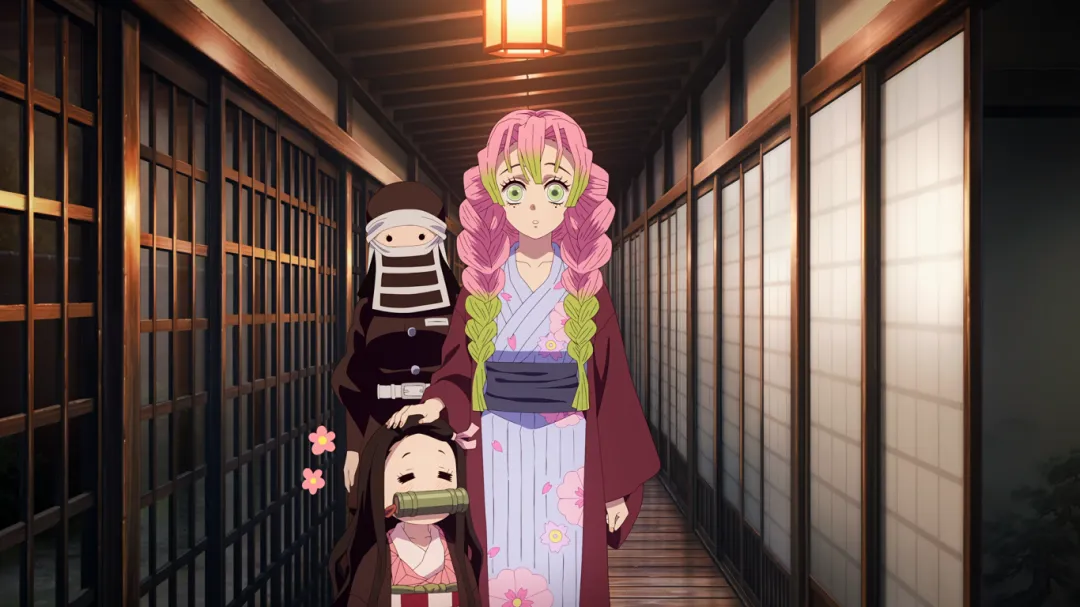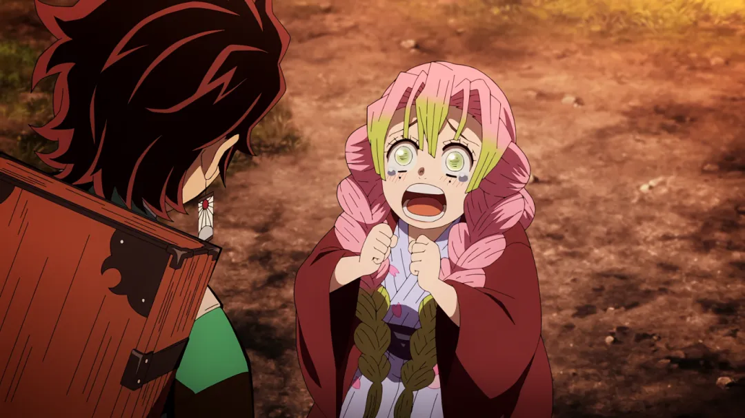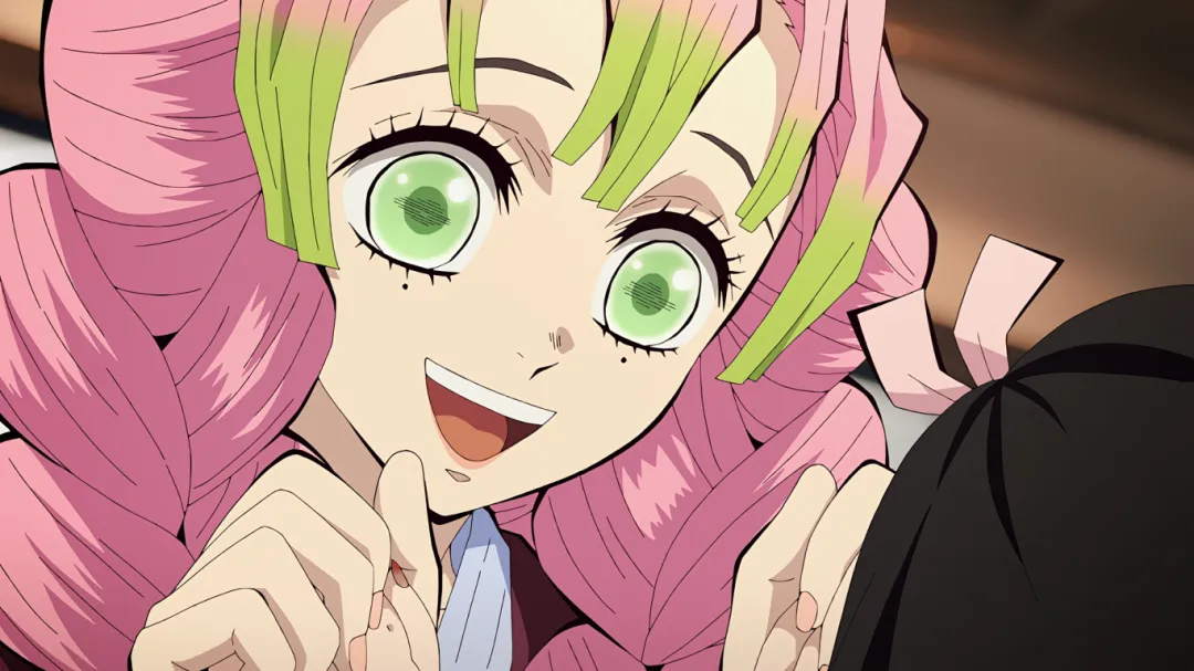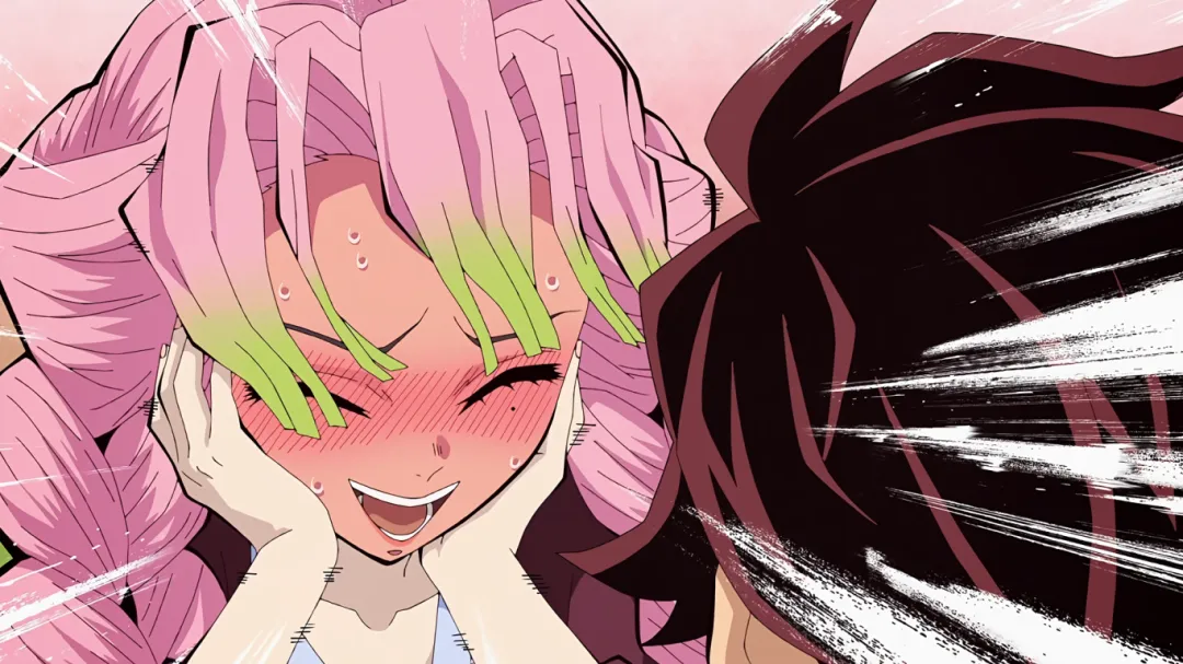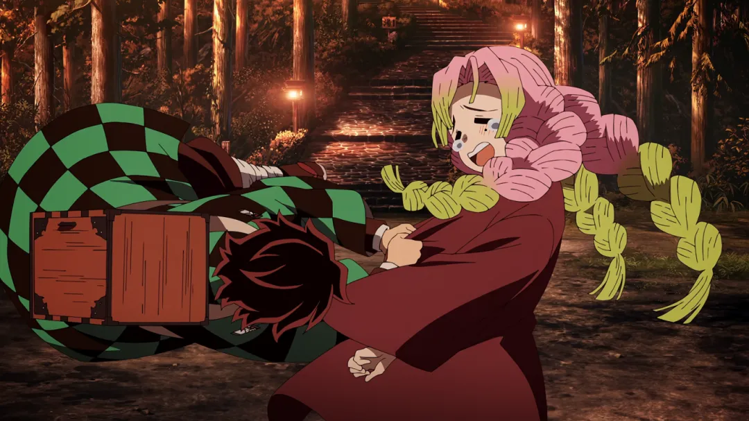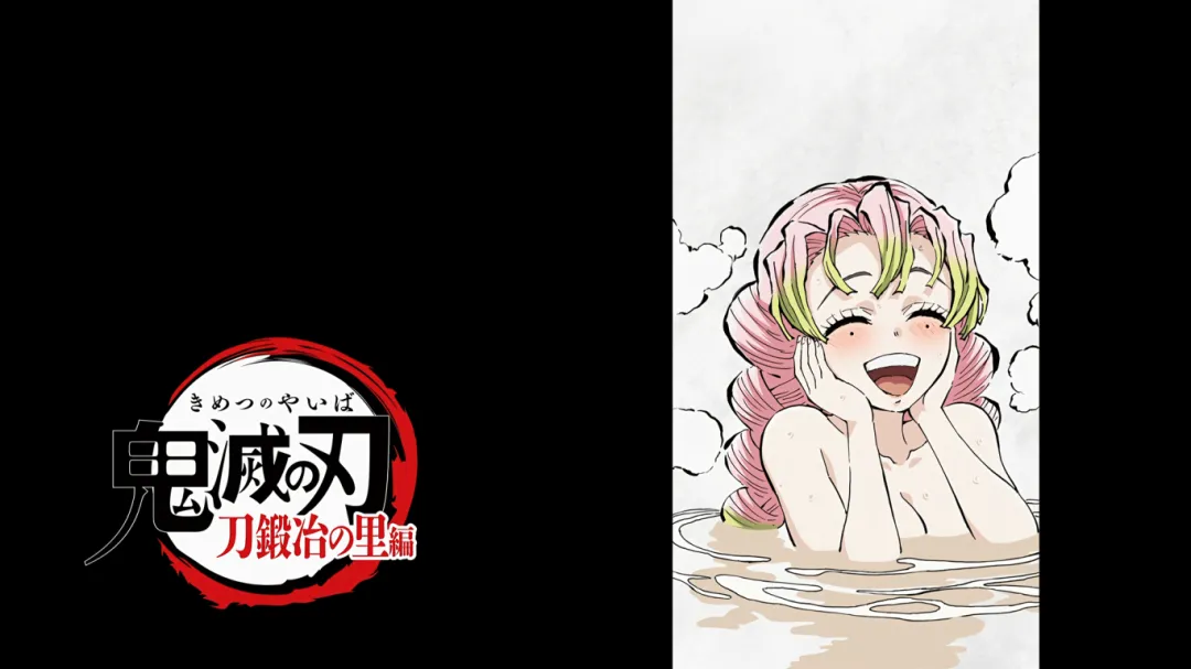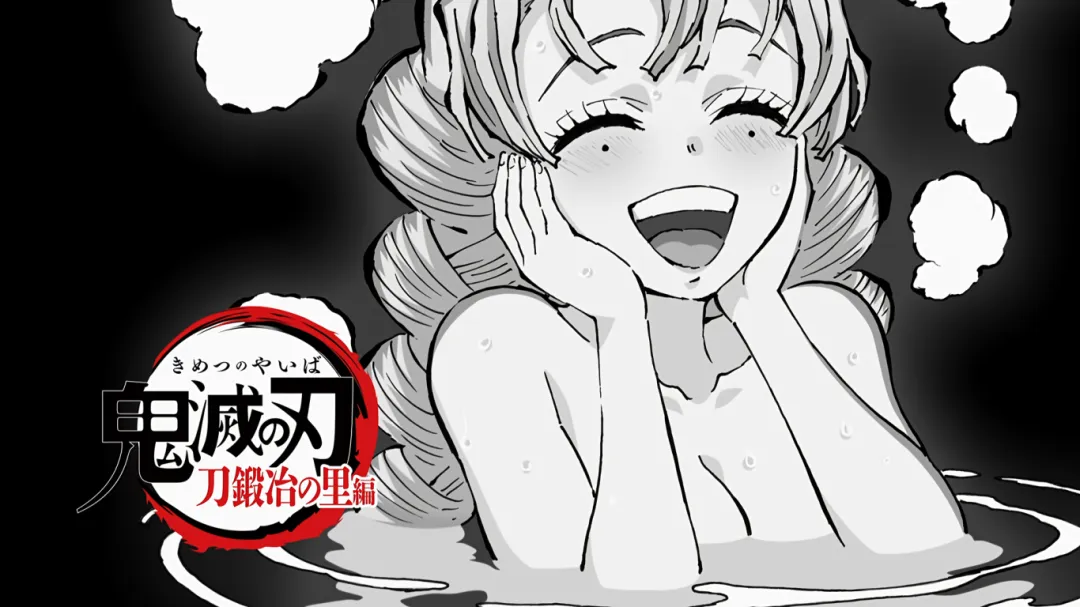 当炭治郎抵达温泉山脚下时遇到了恋柱甘露寺蜜璃,看到炭治郎特别开心,大叫着冲向炭治郎,完全忽视了自己的浴袍会暴露关键部位。