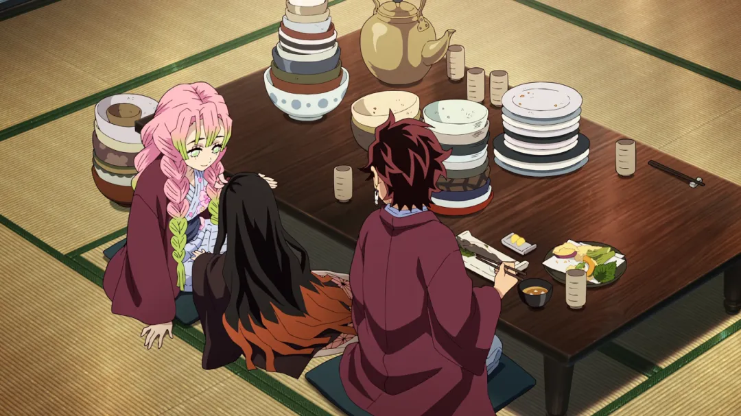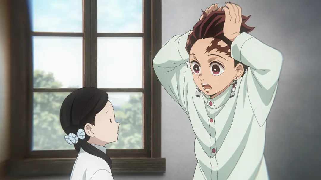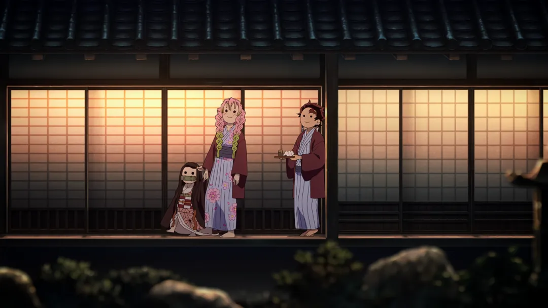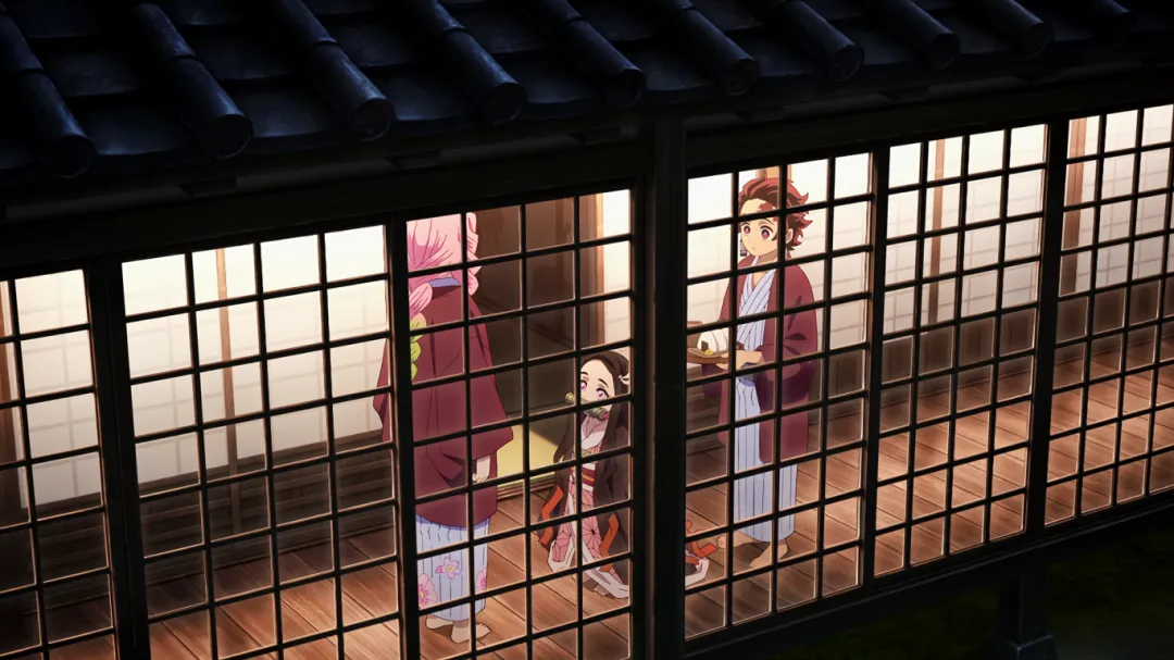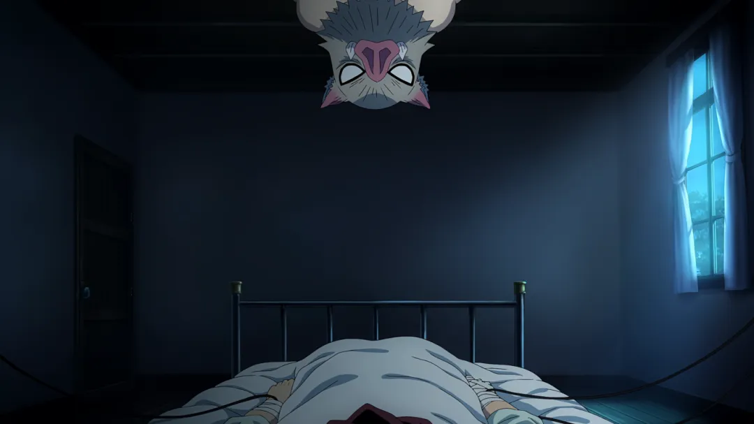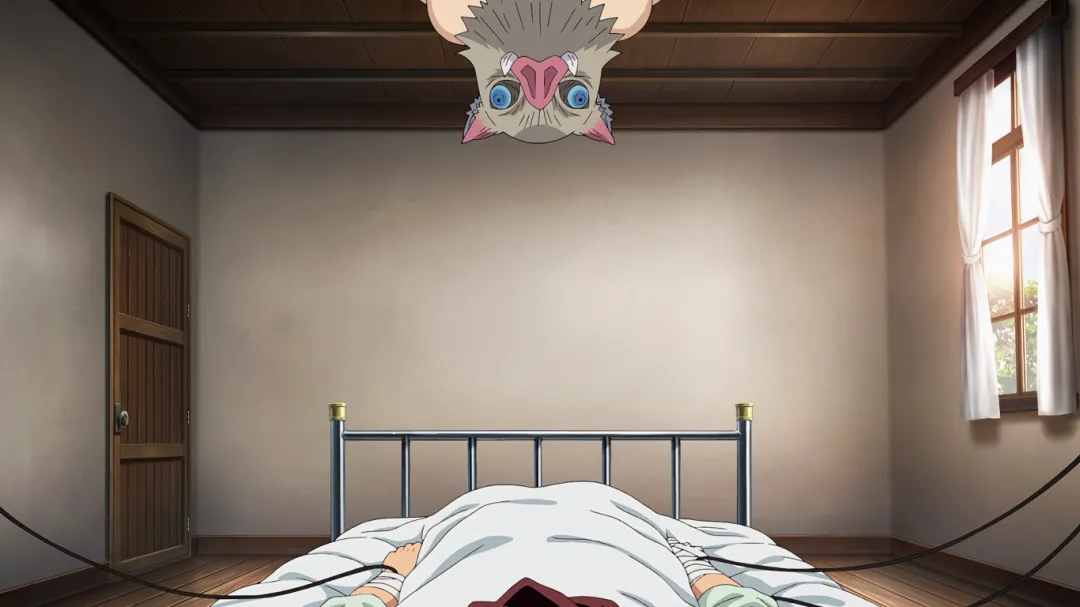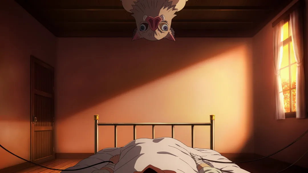 片尾彩蛋:其实伊之助从昨晚就趴在炭治郎房顶了,一晚上一直在叫炭治郎的名字,炭炭能苏醒他功劳少不了。哈哈。