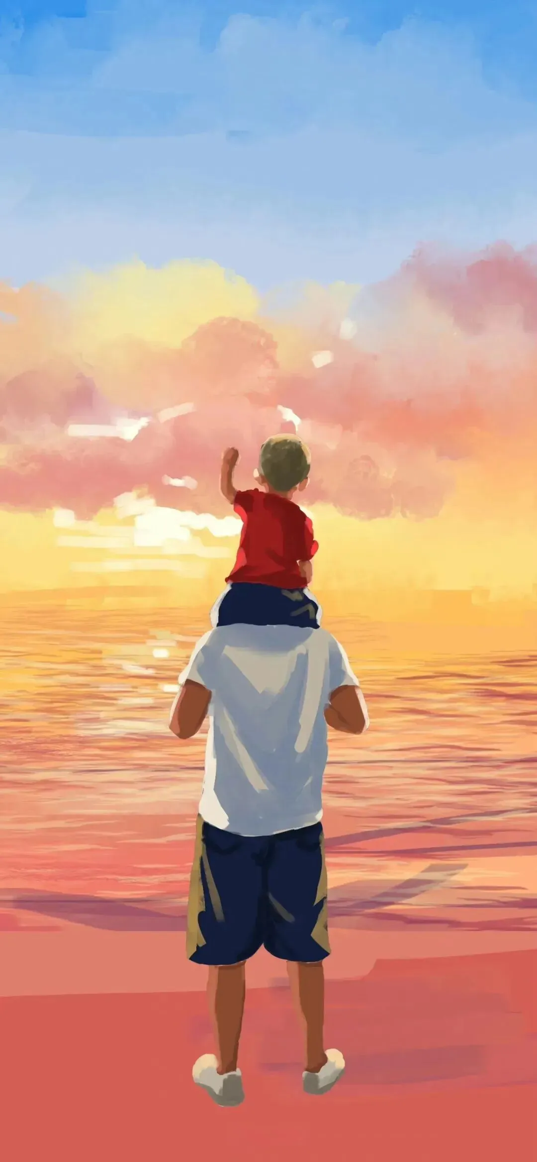 大海在面前铺展,天空在头顶变幻。但在孩子此刻的认知里,最辽阔的,或许是父亲肩头这片小小的、专属的王国。在这里,恐惧被隔绝,不安被消融,只剩下被托举的安全感和探索远方的勇气。父亲沉默的背影,为孩子过滤了世界的风浪,只留下波光粼粼的美好与霞光万道的希望。