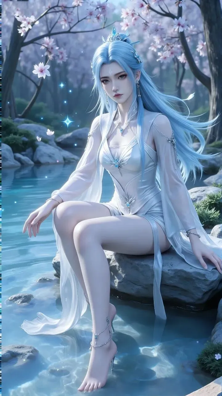 标题:《她坐在溪石上,把樱花冻成星尘——蓝发如瀑,是冰与梦的共生体》