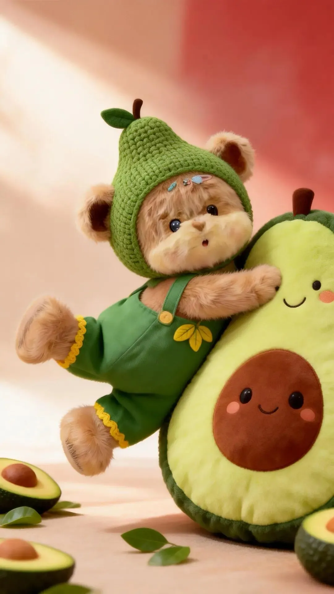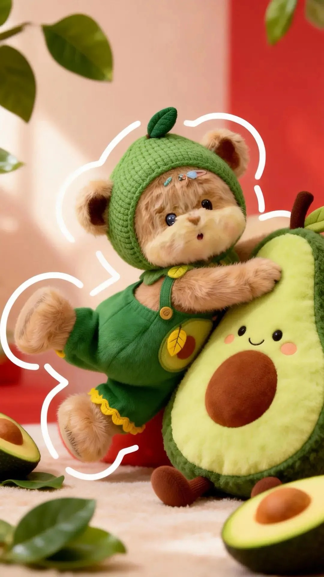这组图里的每一个细节都藏着小心思:小熊脸上的红晕像害羞的少女,牛油果抱枕上的笑脸像在说“别不开心呀”,红色背景的福字像在为你祈福。它们不是简单的玩偶,而是我们内心的投射——我们渴望被爱,渴望被治愈,渴望在平凡的日子里,找到属于自己的小确幸。