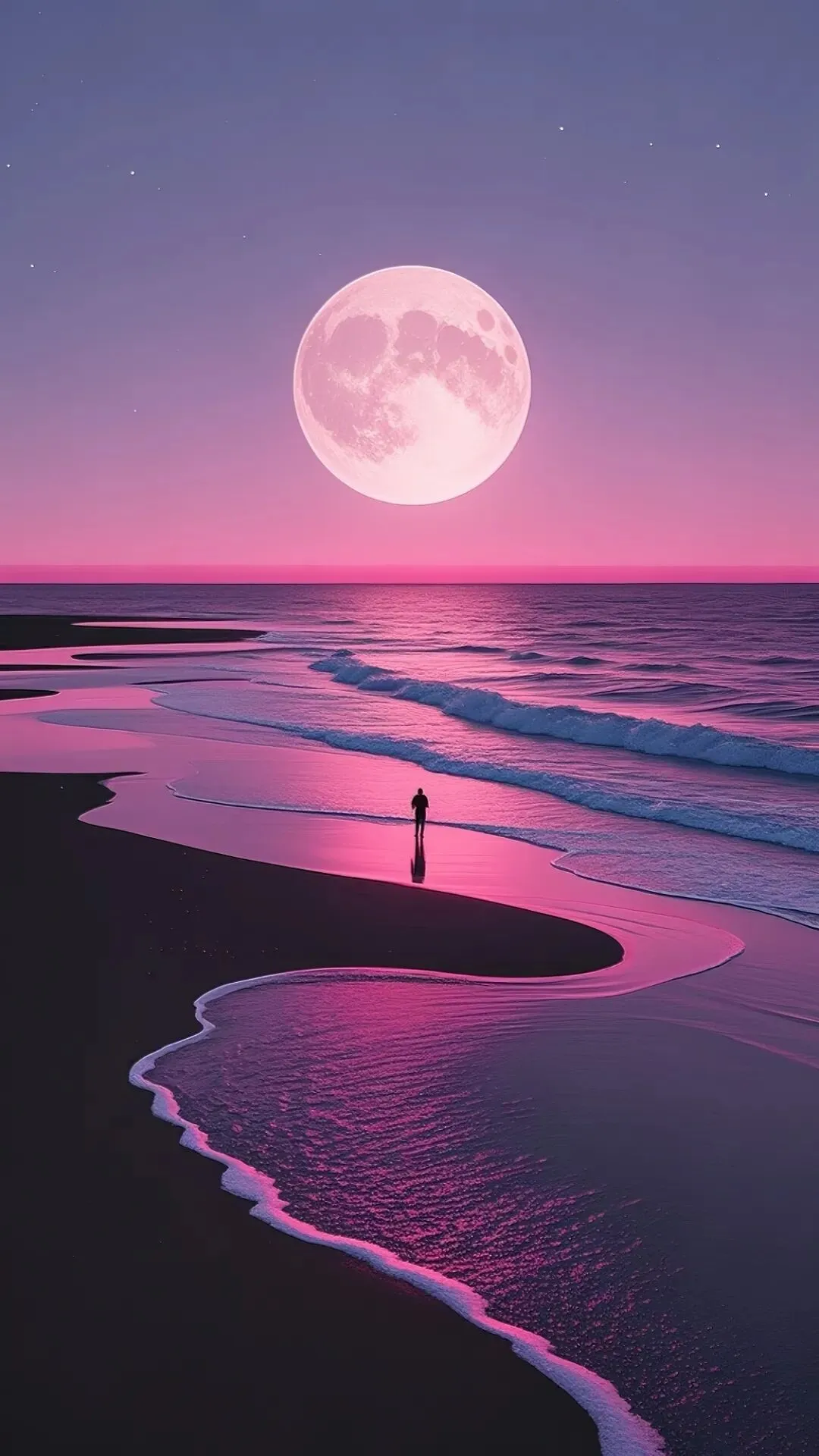 粉紫渐变的天空,圆月悬于海面,一人立于沙滩,浪漫又孤独,氛围感拉满。