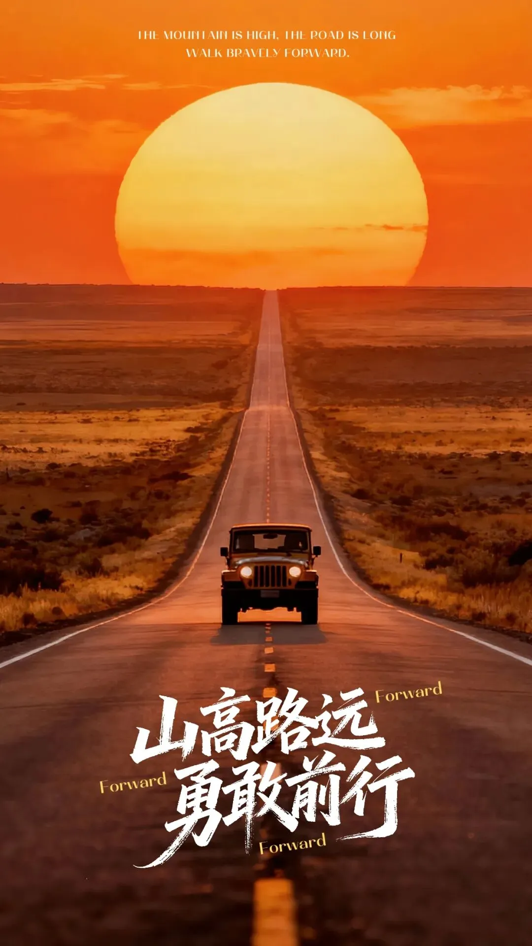 落日熔金,长路漫漫,配一句“山高路远,勇敢前行”,热血又治愈,适合打工人与追梦人。