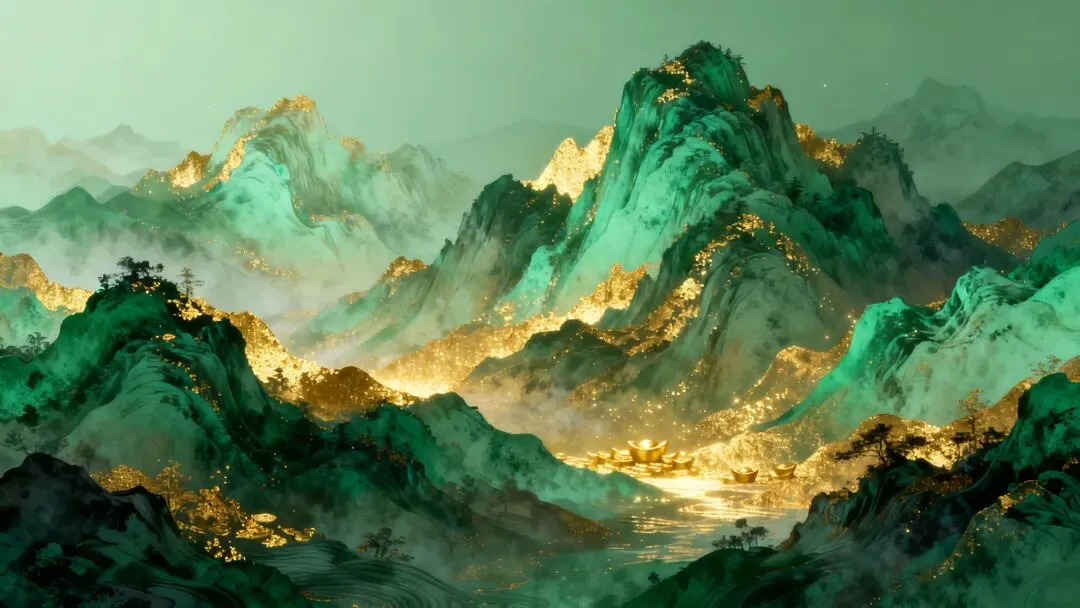 层叠山水与金色光芒,寓意背靠金山、财源不断