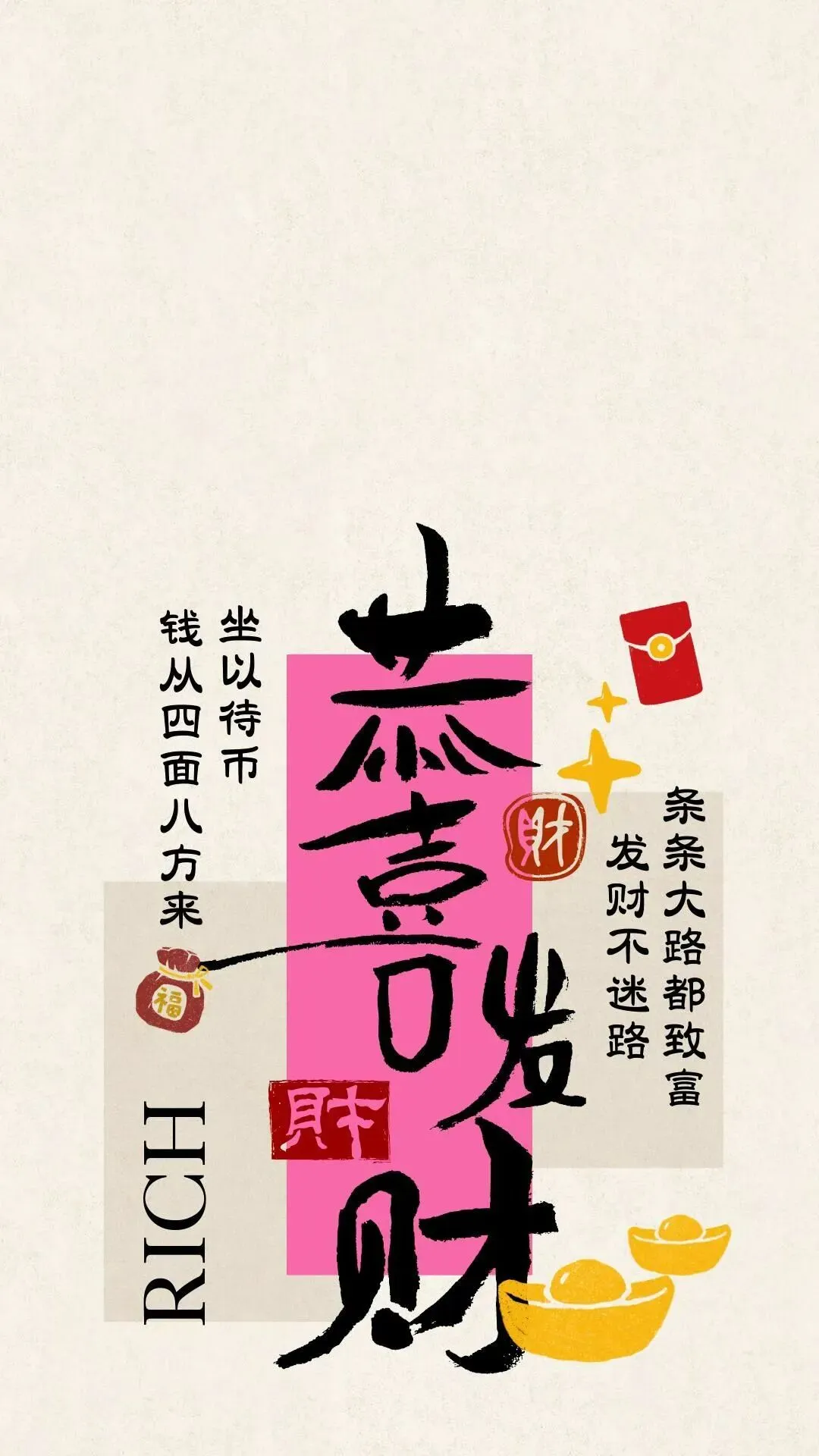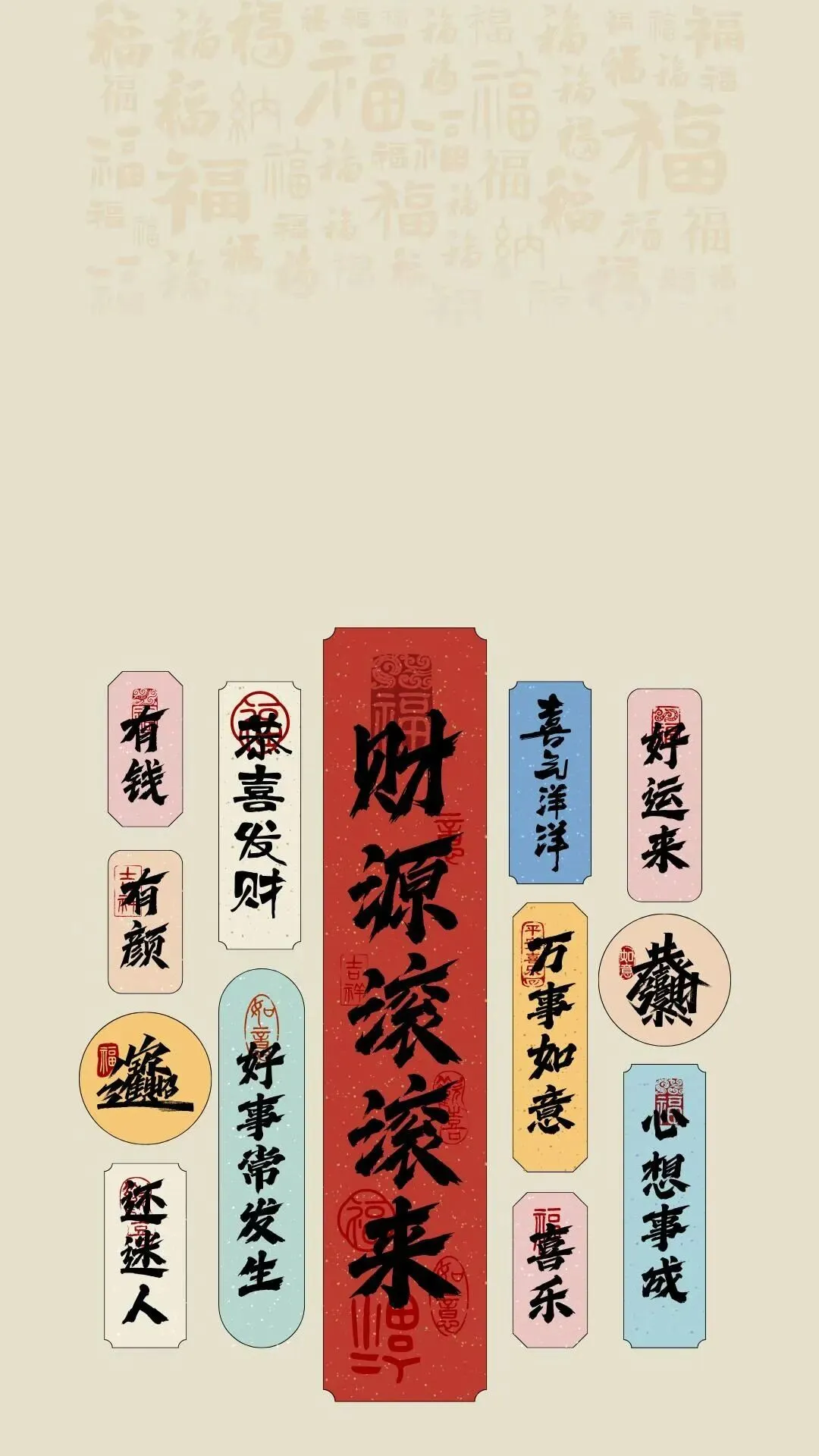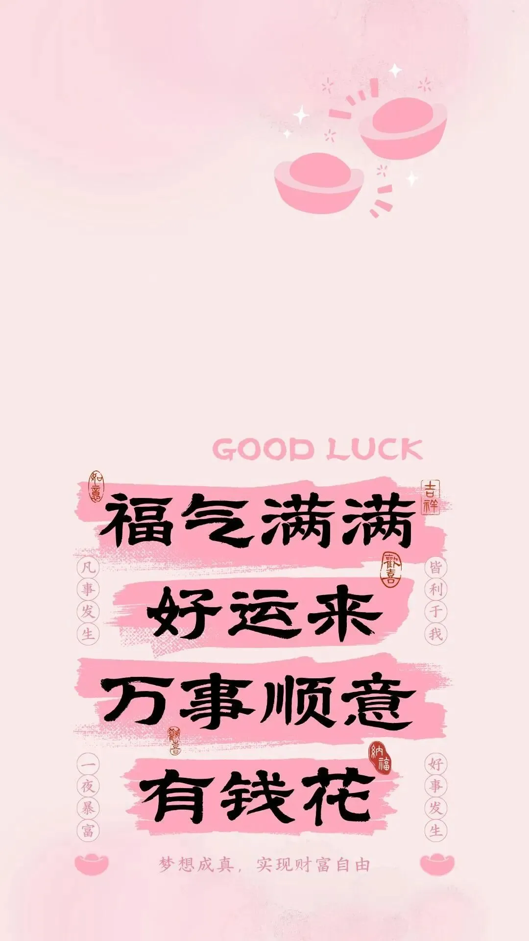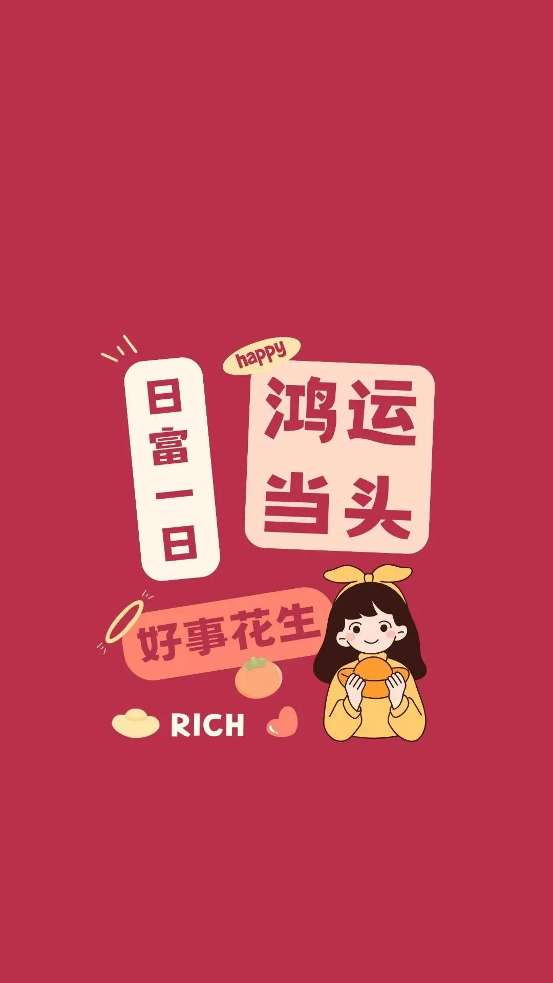 这组壁纸藏着马年最朴实的愿望:财源滚滚,福气常伴。红底的“有钱途”自带气场,粉系的“有钱花”温柔讨喜,还有满屏的“事事顺心”与“鸿运当头”。把吉利话设为壁纸,让好运从点亮屏幕开始,日日得偿所愿,年年顺遂安康。