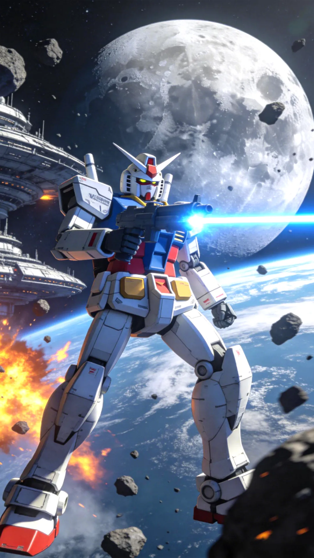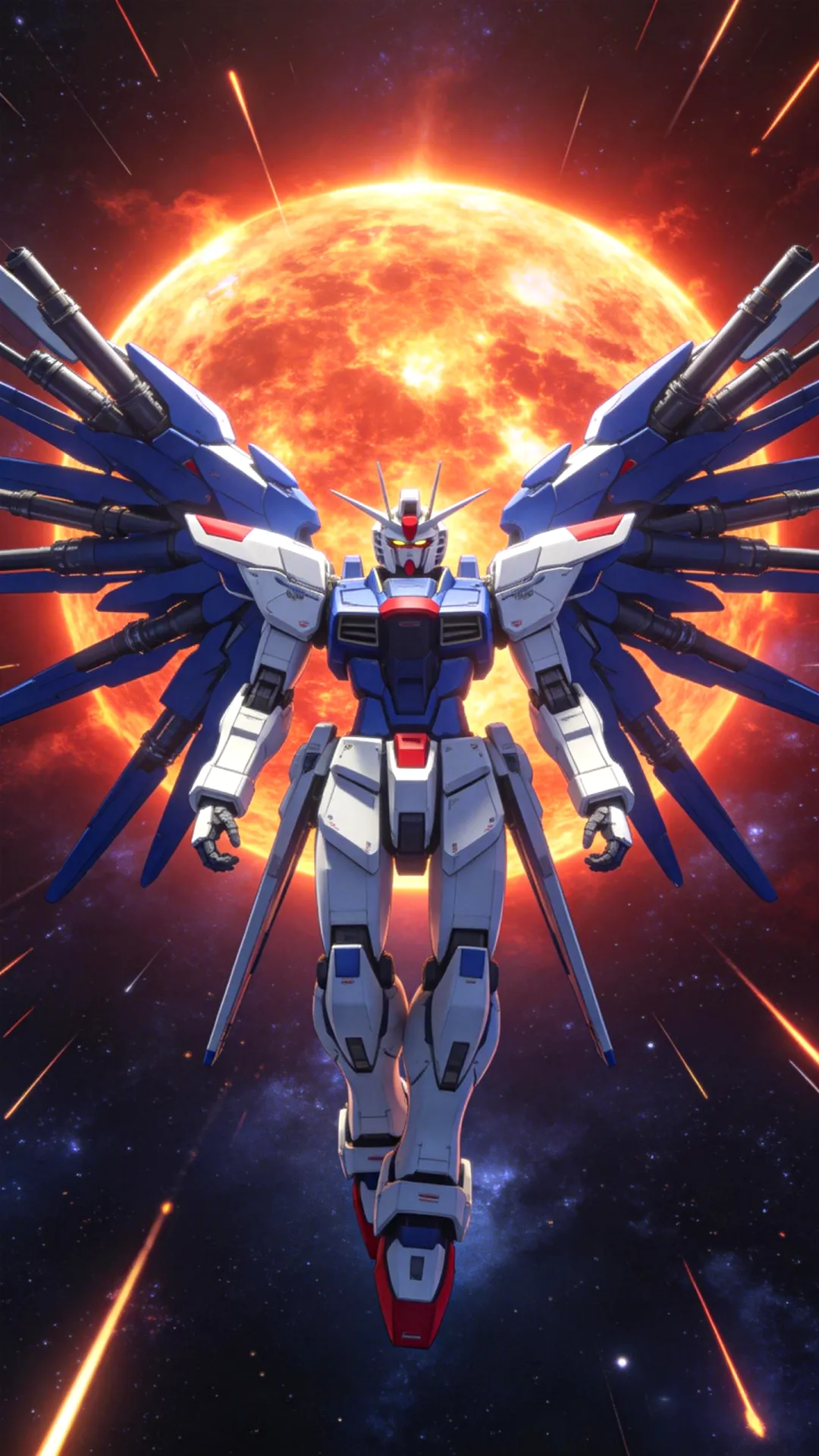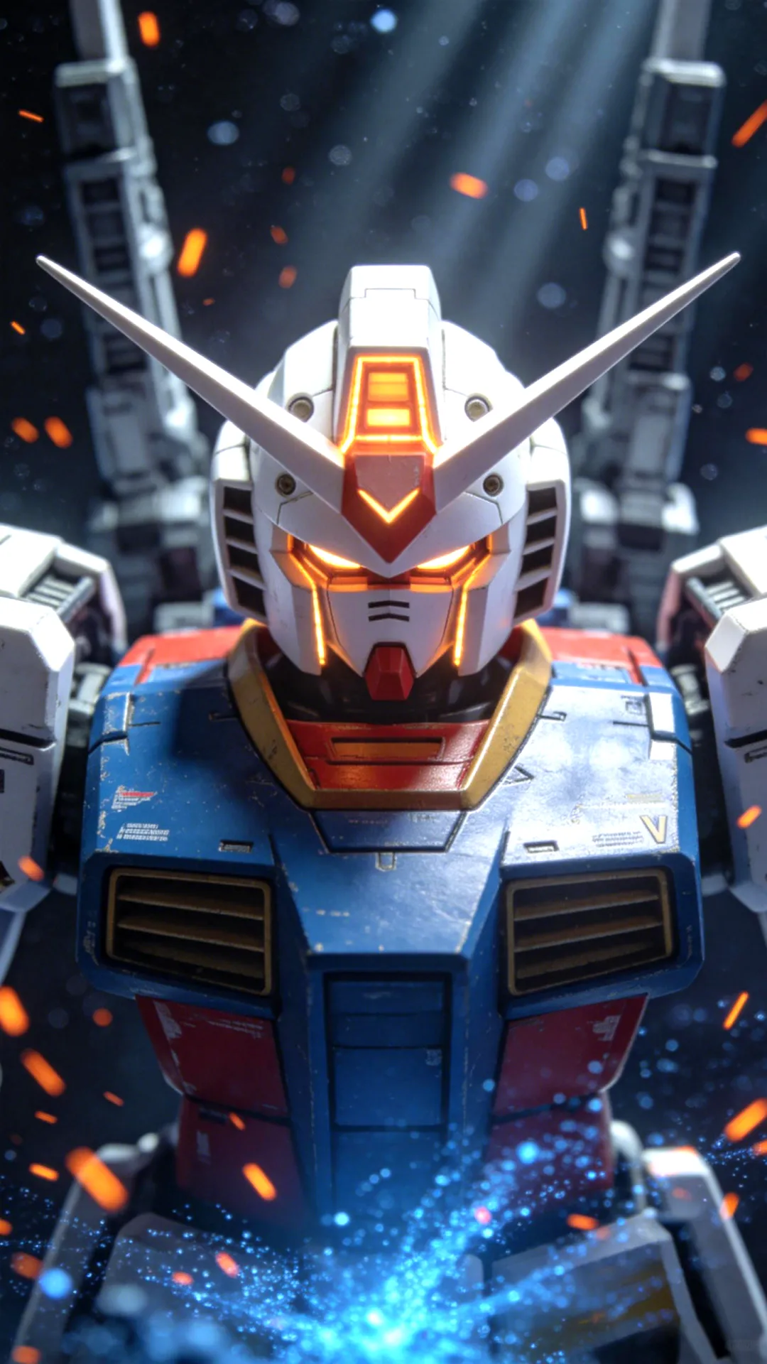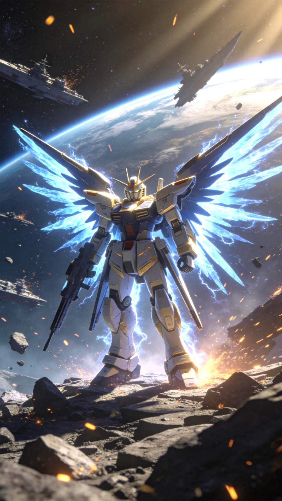 RX-93 ν高达,正面特写,头部 V 型天线,精神感应框架发光,白蓝红配色,精密机械细节,金属质感,微缩模型摄影风格,背景为深邃宇宙与机械结构,橙色火花飞溅,底部蓝色粒子光效,丁达尔效应,电影级布光,8k 分辨率,超高清,史诗感,冷色调,景深虚化主体:自由高达,机动战士,白色与蓝色装甲,红色点缀,背部展开巨大的龙骑兵浮游炮翼,机械天使,悬浮姿态。 环境:浩瀚宇宙,背景是巨大的燃烧恒星,橙红色光芒,流星划过,太空战场,史诗氛围。 风格:日式动漫风格,高达 SEED 风格,精细机械细节,8k 分辨率,CG 渲染,电影级光照,高对比度,冷暖色调对比。 镜头:正面全身照,低角度仰视,中心构图,景深效果,锐利焦点。 参数:--ar 9:16 --q 2 --style raw强袭自由高达,全身像,机动战士高达 SEED DESTINY,基拉大和座机,巨大的蓝色光之翼,能量粒子特效,站在破碎的陨石带上,宇宙空间背景,远处有地球弧线,漂浮的战舰残骸,火花飞溅,史诗感,电影级光照,体积光,丁达尔效应,8k 分辨率,超精细细节,机械质感,金属光泽,3D 渲染,OC 渲染,虚幻引擎 5,赛博朋克色彩,冷色调为主,金色点缀,低角度仰视,宏大场景,杰作。Z 高达,机动战士,白色机甲,特写镜头,低角度仰视,胸口巨大的蓝色水晶核心,发光,V 型天线,精密机械细节,哑光白装甲,背景是破碎的悬浮冰晶,玻璃碎片,冷色调,冰蓝色光影,丁达尔效应,粒子效果,新世代二次元风格,厚涂,高细节,8k 分辨率,杰作,科幻概念艺术,神圣感,静谧而充满力量RX-93 ν 高达,机动战士高达:逆袭的夏亚,全身像,太空战斗场景,地球轨道背景,巨大的月球,手持光束步枪射击,蓝色等离子光束,爆炸火焰,漂浮的陨石碎片,太空殖民地,精密机械细节,金属质感,白蓝红配色,V 型天线,低角度仰视,动态模糊,电影级光照,史诗感,8k 分辨率,超精细,动漫风格,3D 渲染质感,强烈的色彩对比,科幻大片氛围