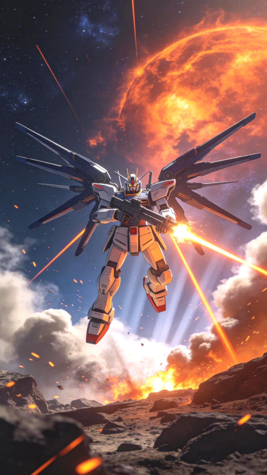 强袭自由高达,ZGMF-X20A,机动战士高达 SEED DESTINY,全身像,悬浮于异星崎岖岩石地表之上,超级龙骑兵系统浮游炮展开,手持光束步枪射击,枪口火焰,身后有橙色光束轨迹。 背景是深邃的宇宙星空,巨大的橙红色星云,战火硝烟,爆炸火花,体积光,丁达尔效应。 低角度仰视镜头,极具压迫感,动态模糊,速度线。 8k 分辨率,超精细细节,金属质感,机械结构复杂,赛璐璐 shading,CG 渲染,Unreal Engine 5,电影级光照,史诗感,科幻战争大片,橙色与深蓝色的强烈对比色调。