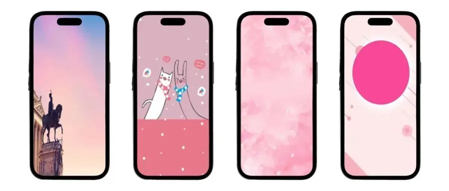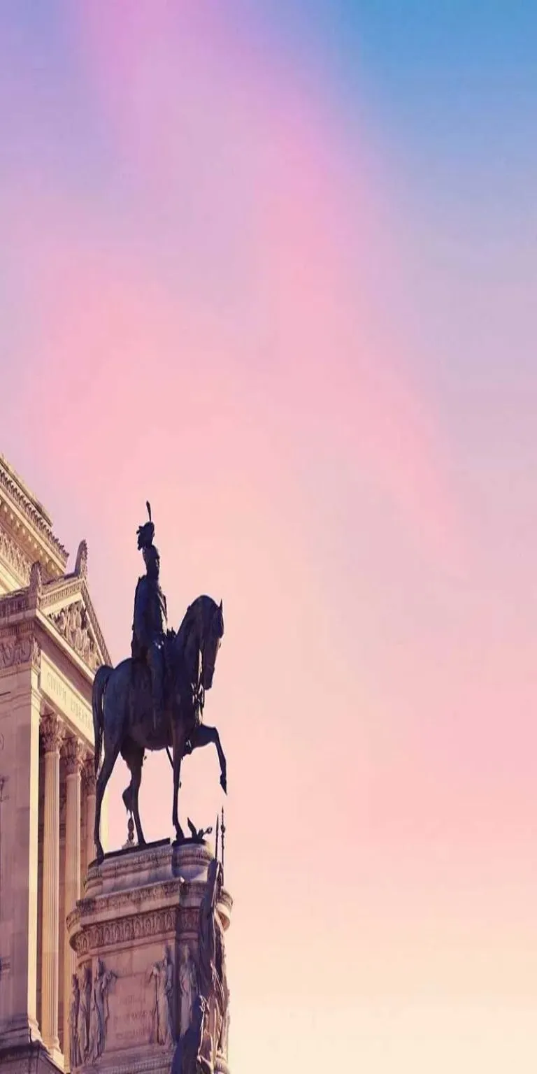 雕像与萌宠,粉色天空下的梦幻(手机壁纸)