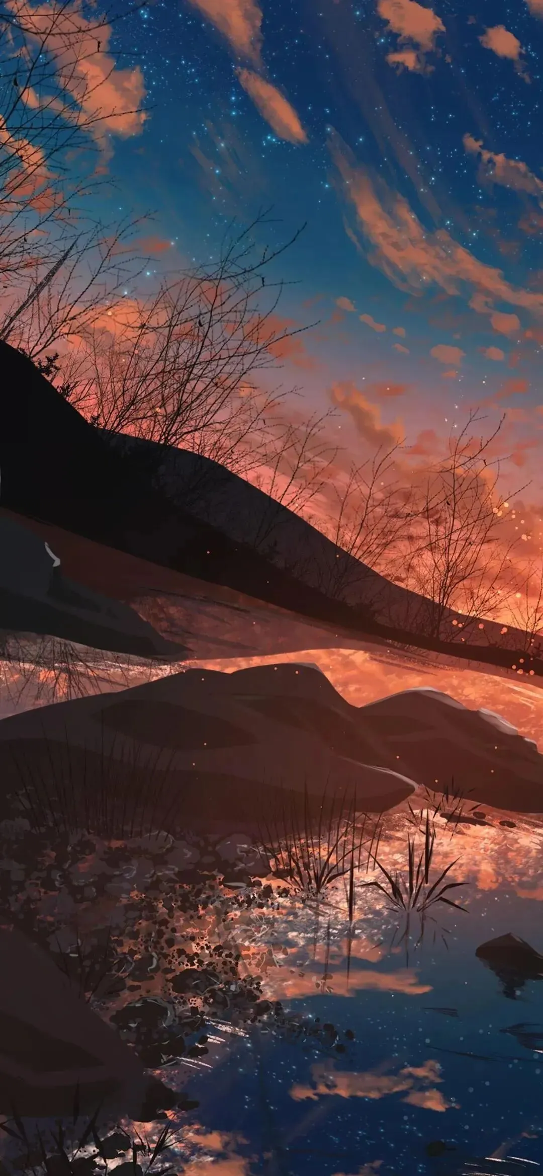 秋意溪流,月下雪山景(高清手机壁纸)