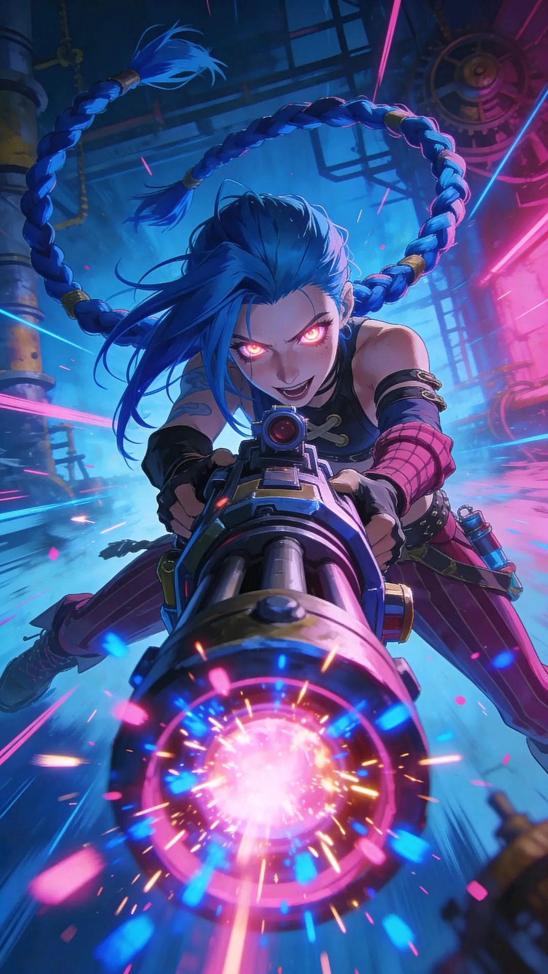 这张真的第一眼就炸了!金克丝举着巨型重炮对准镜头,蓝发双马尾在风里飞扬,红眼在炮火里发光,炮口的粉紫光焰直接把氛围感拉满。