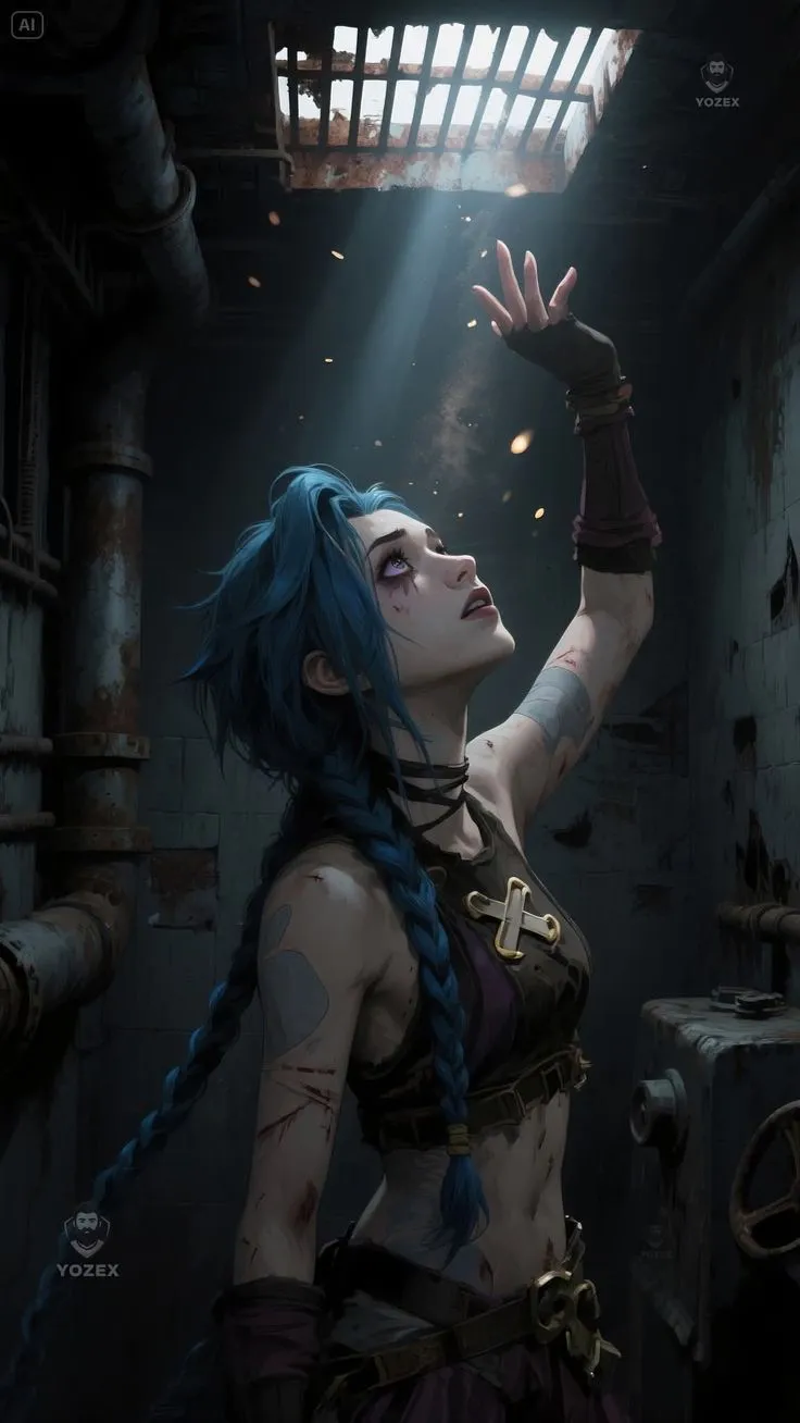 这张的破碎感太绝了!金克丝浑身带伤,仰头迎着光,蓝发凌乱,眼神里全是故事,像刚打完一场硬仗,又疯又美。