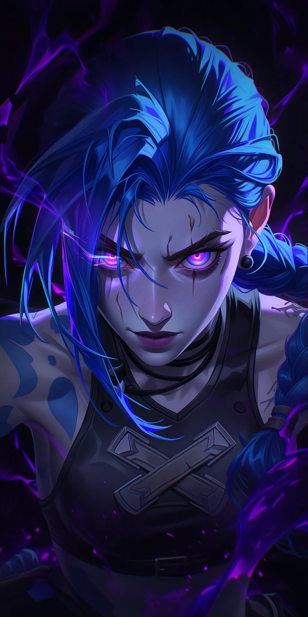 这张的压迫感直接拉满!金克丝在紫雾里凝视镜头,蓝发在霓虹光里发光,红眼像燃着火焰,纹身和服饰的细节精致到不行。