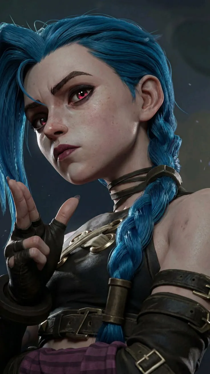 这张的拽姐感太绝了!金克丝对着镜头比出挑衅手势,蓝发双马尾,红眼锐利,服饰的金属扣和绑带细节拉满,像在说 “来战”。