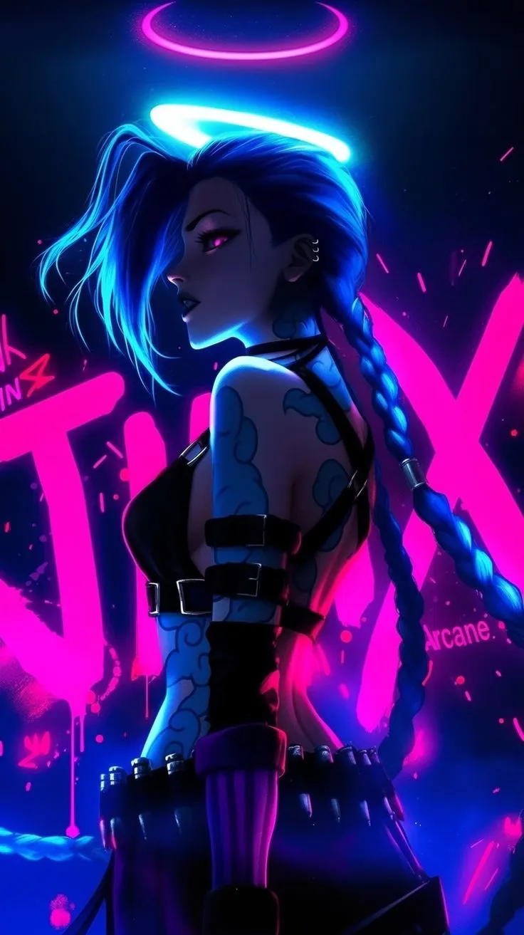 这张的赛博感太绝了!金克丝背对着镜头,头顶光环,蓝发在霓虹光里发光,纹身和绑带细节拉满,紫粉色的霓虹把氛围感拉满。