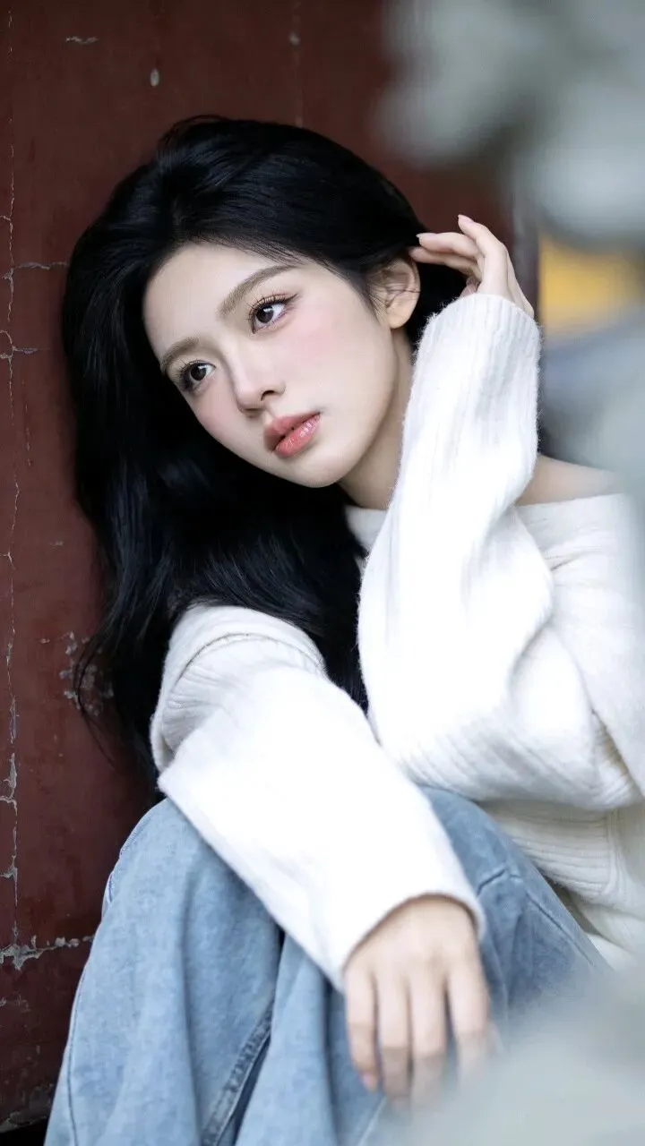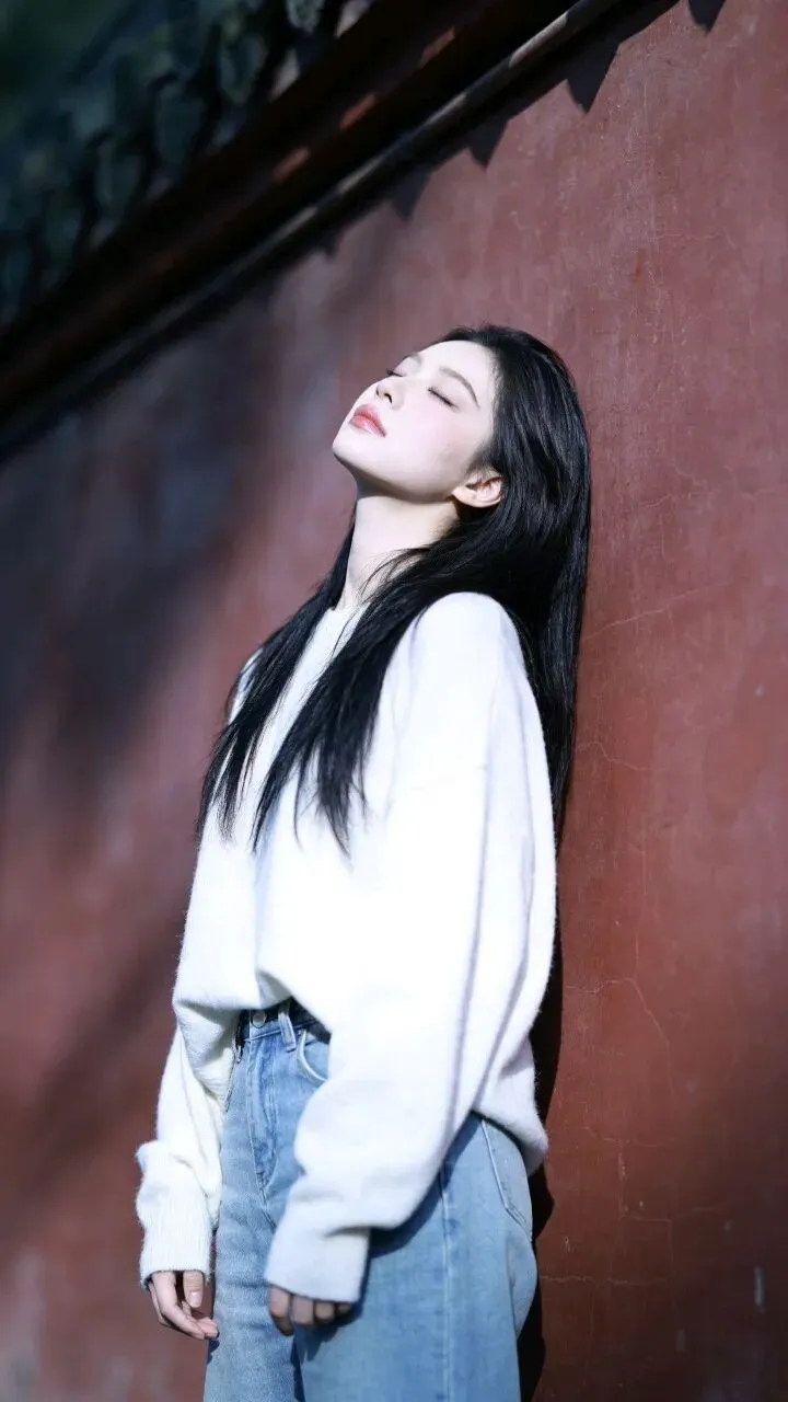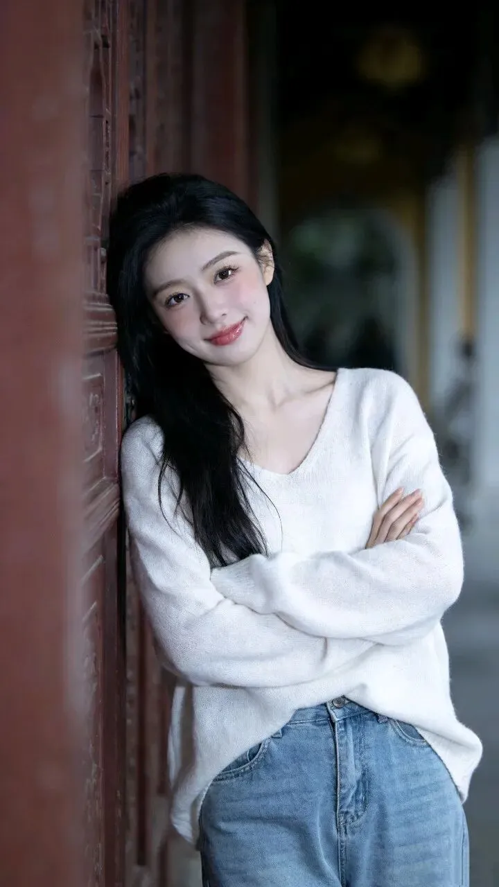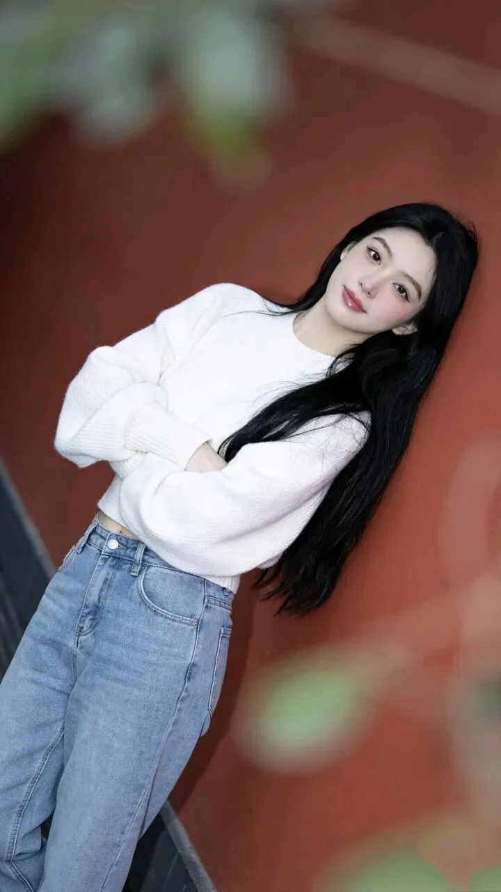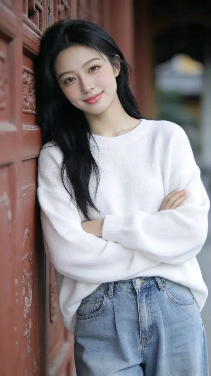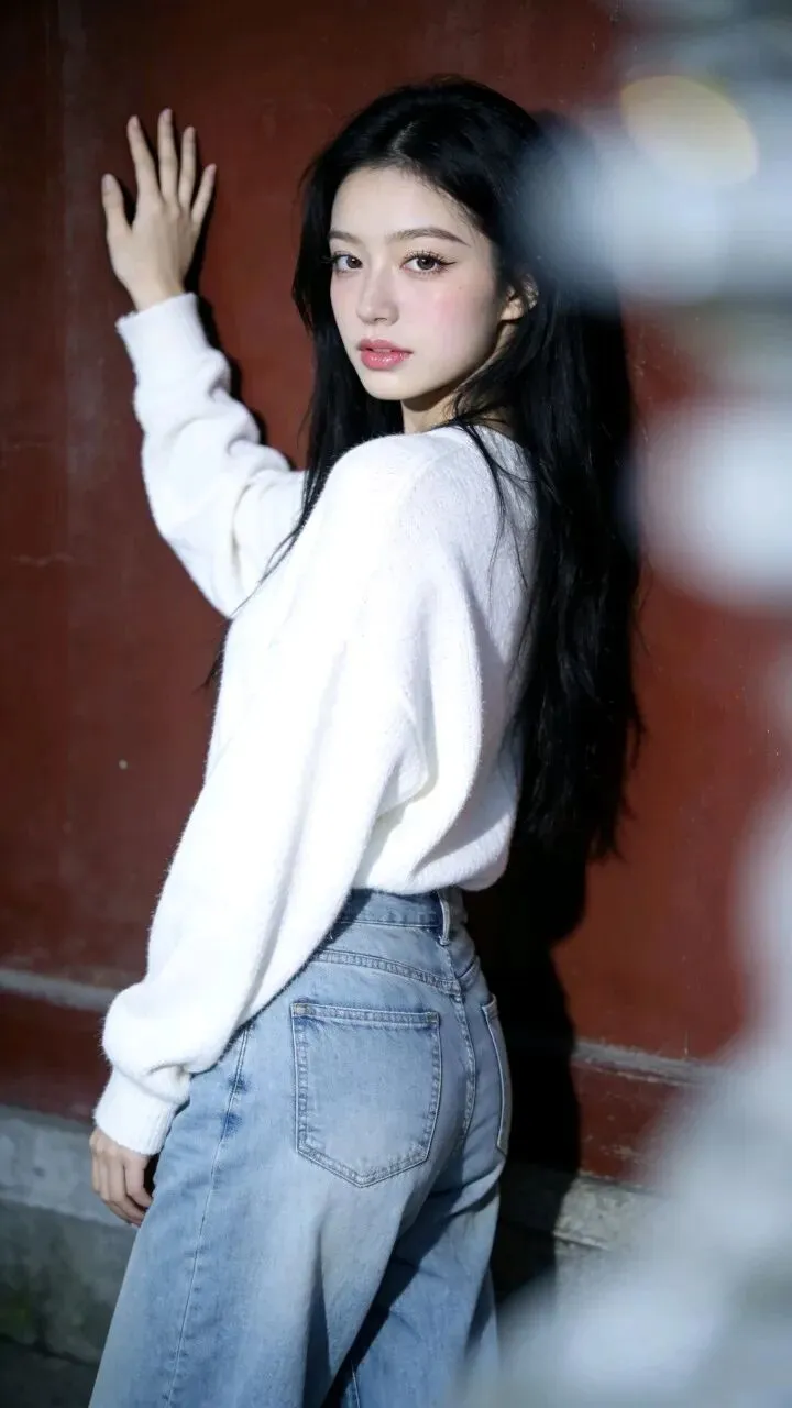 白色毛衣的绒面蹭着粗粝墙面,牛仔裤的蓝淡得像被时间洗过。