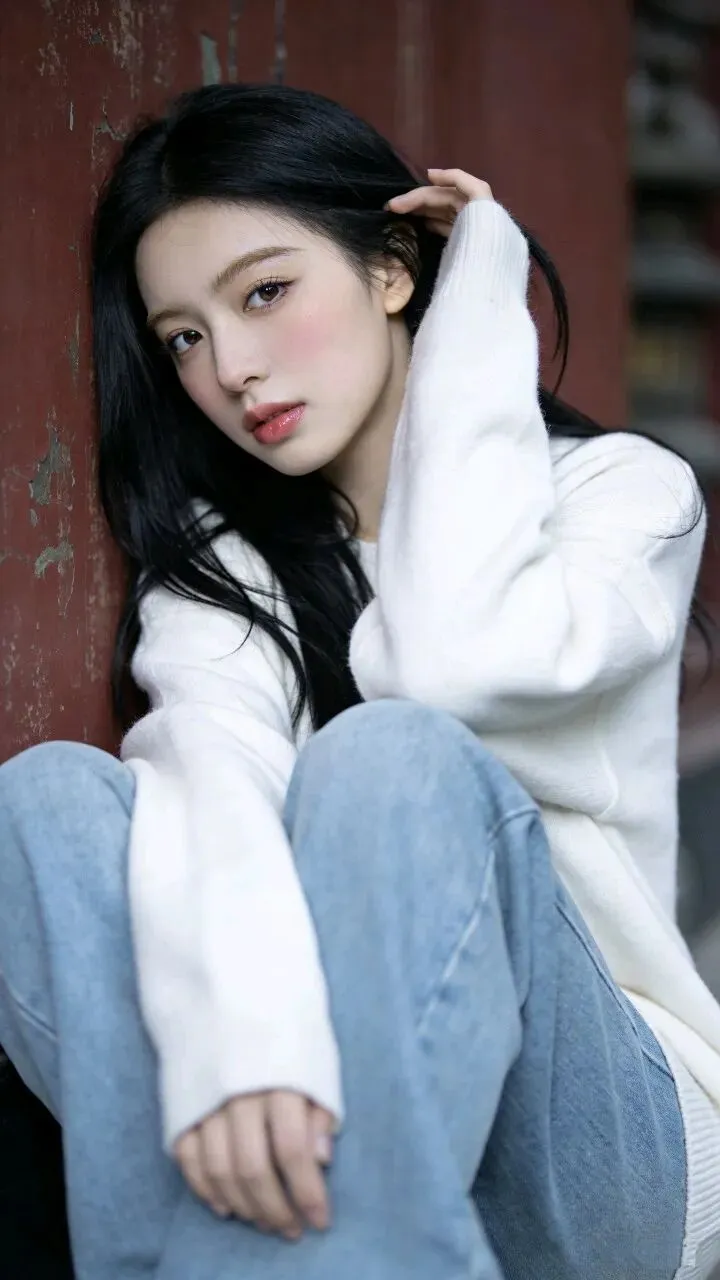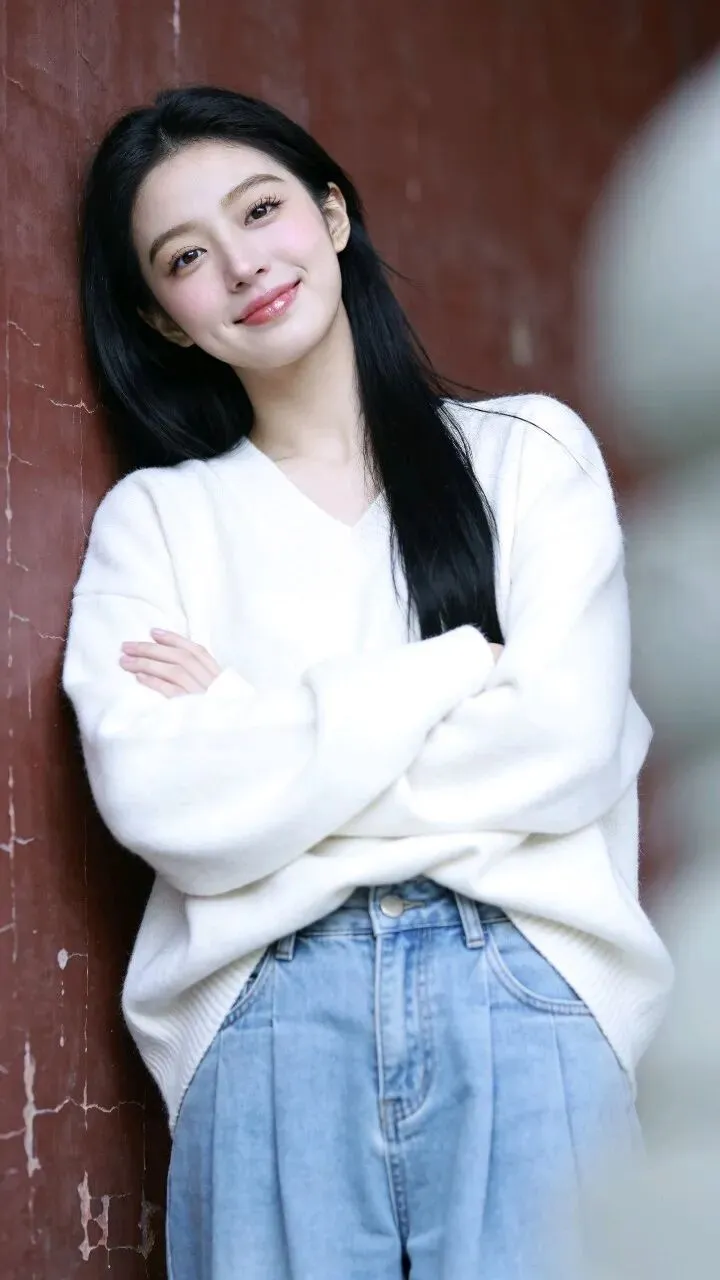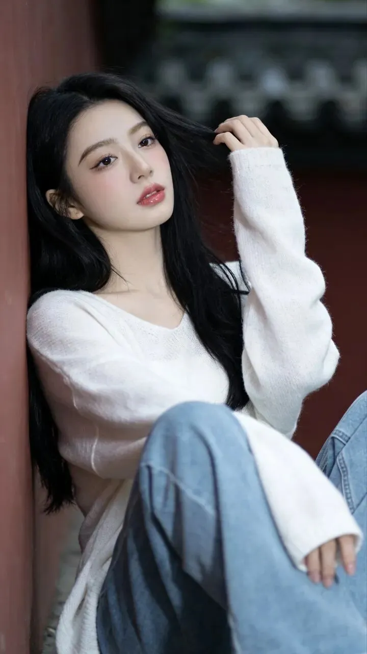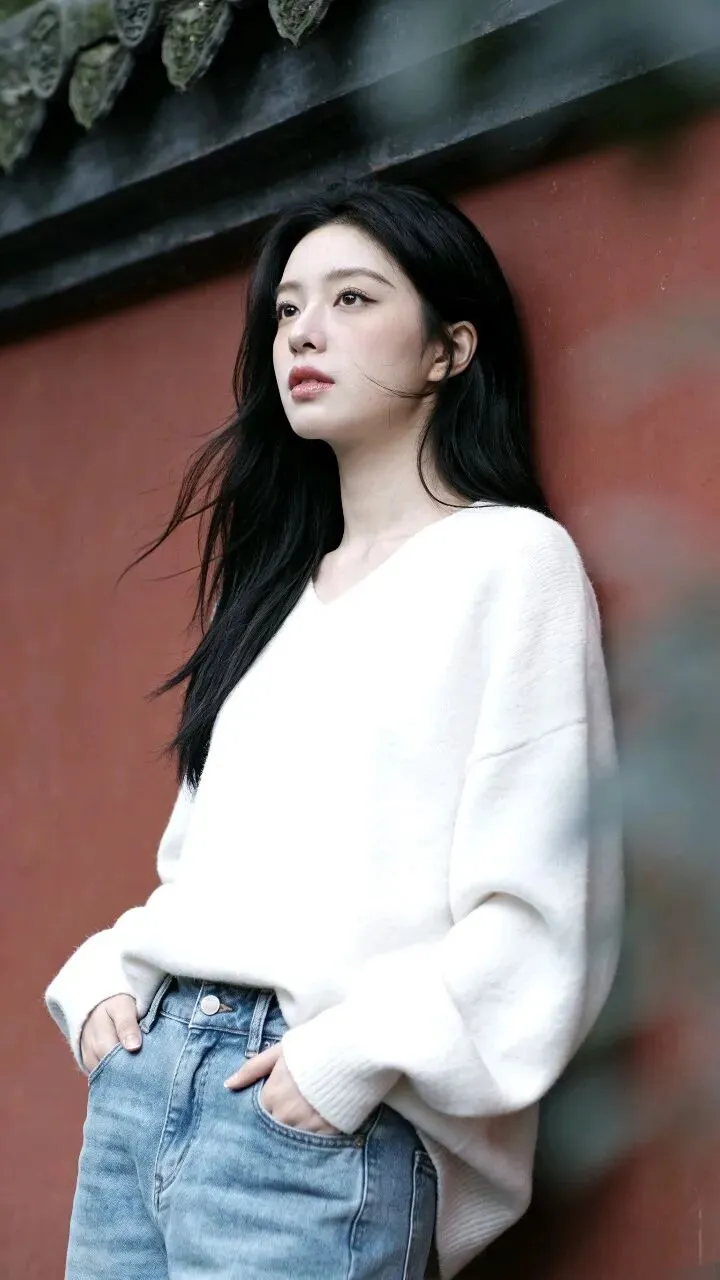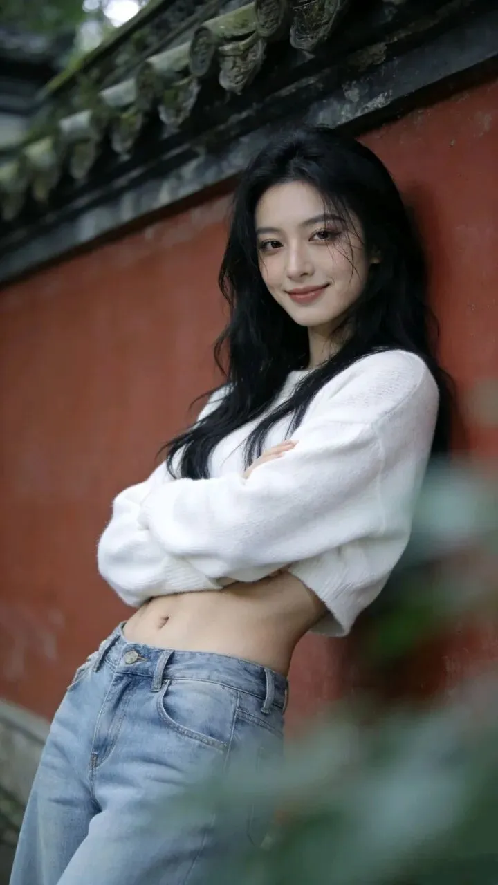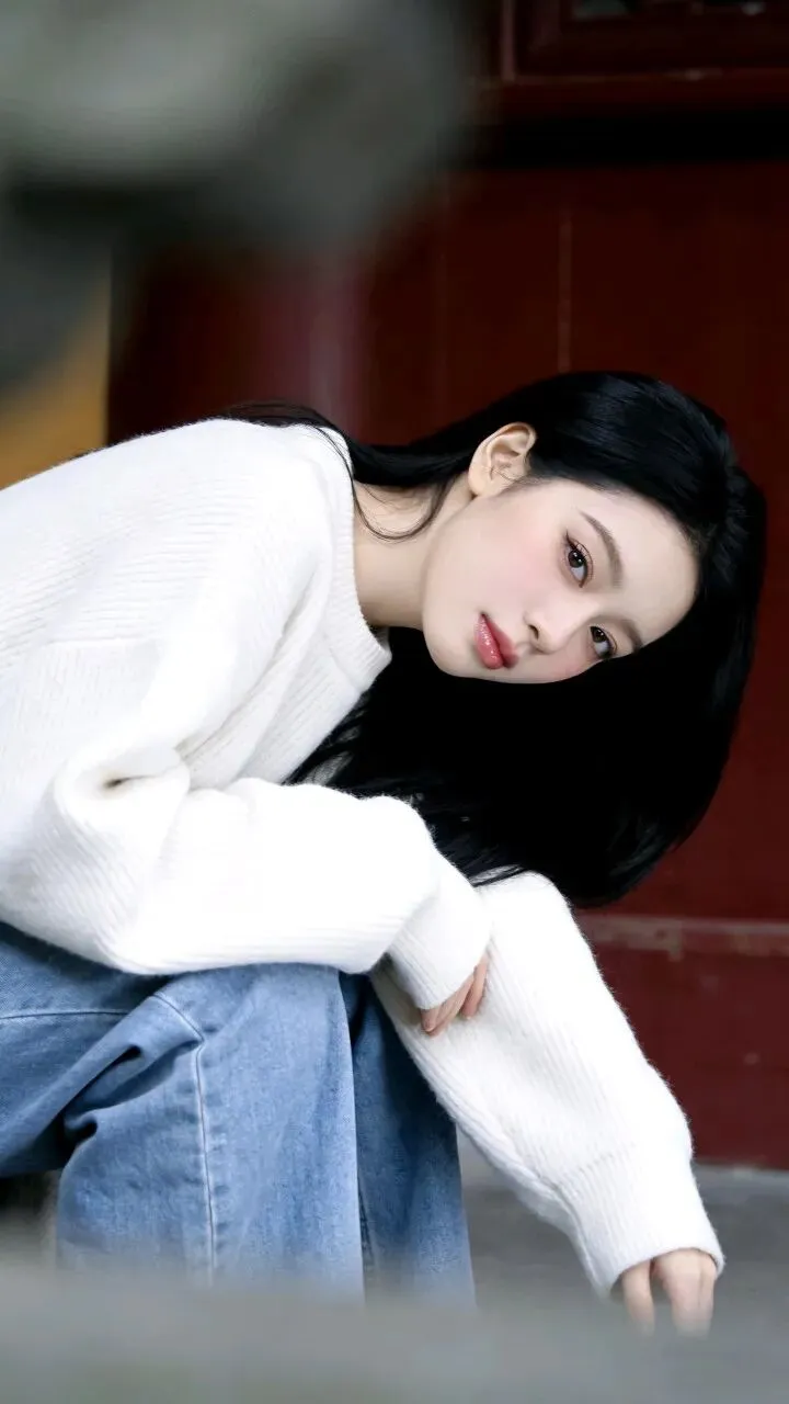 白色毛衣的绒面蹭着粗粝墙面,牛仔裤的蓝淡得像被时间洗过。