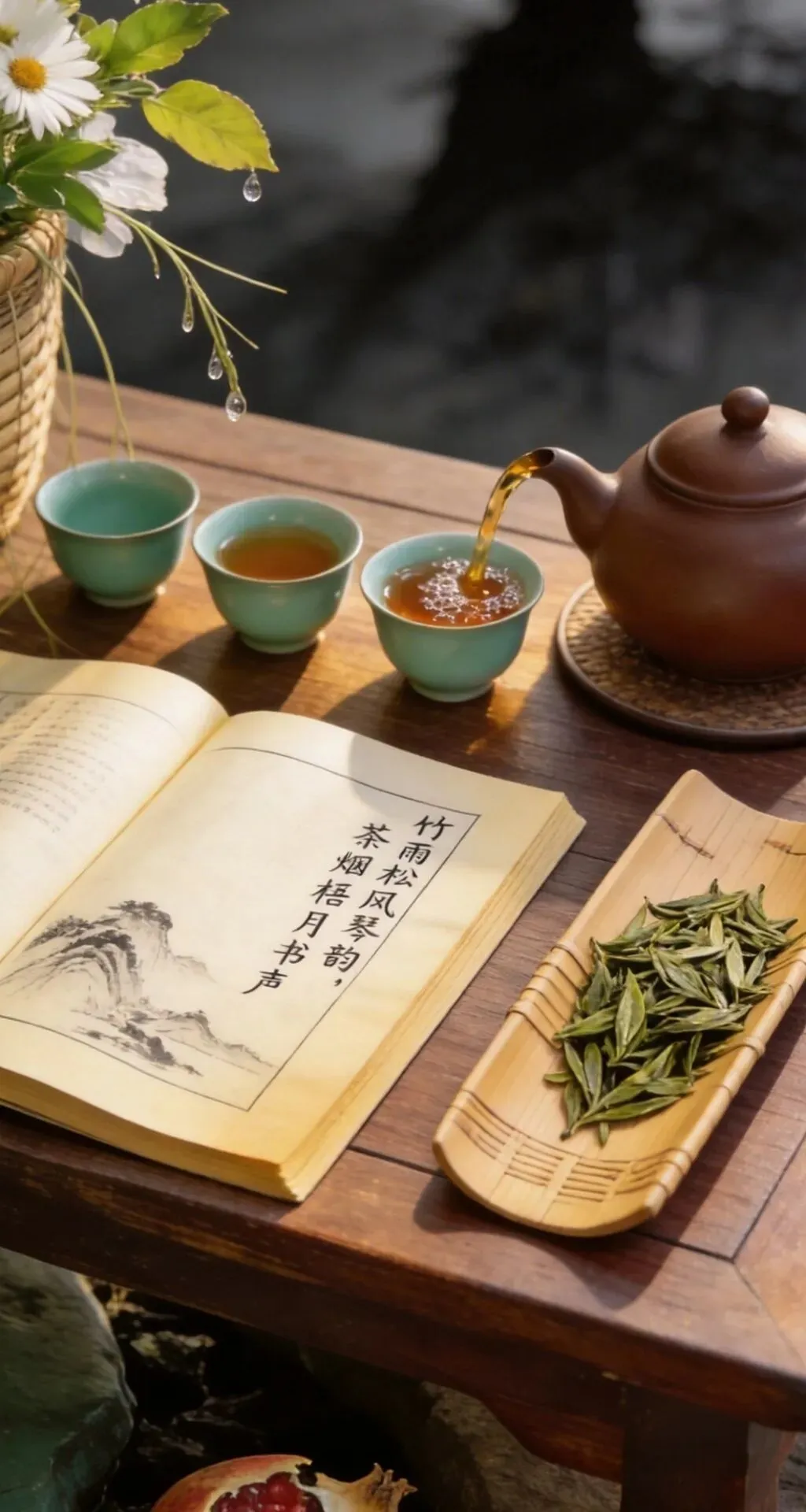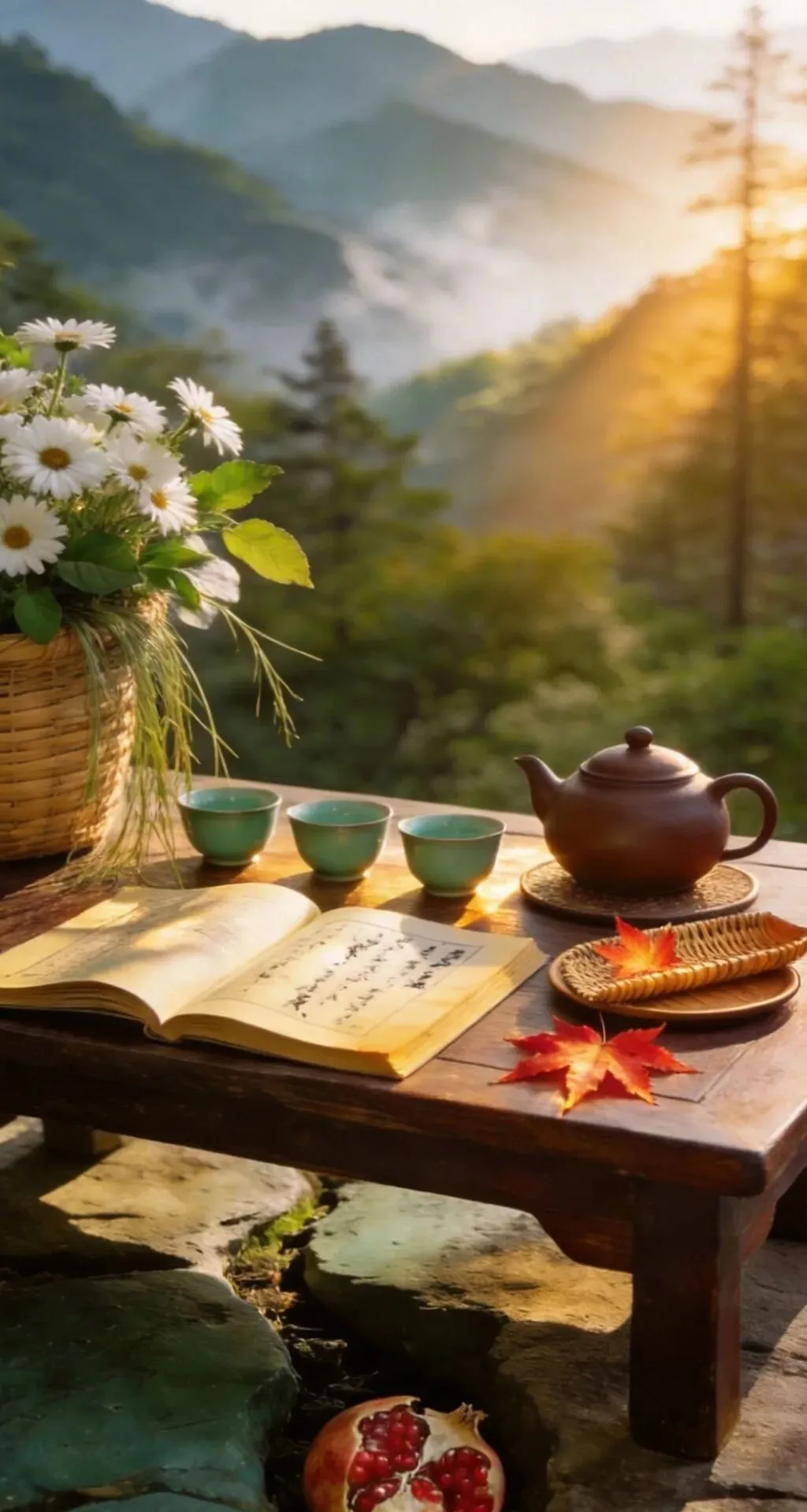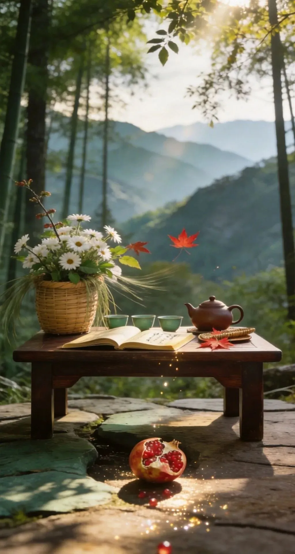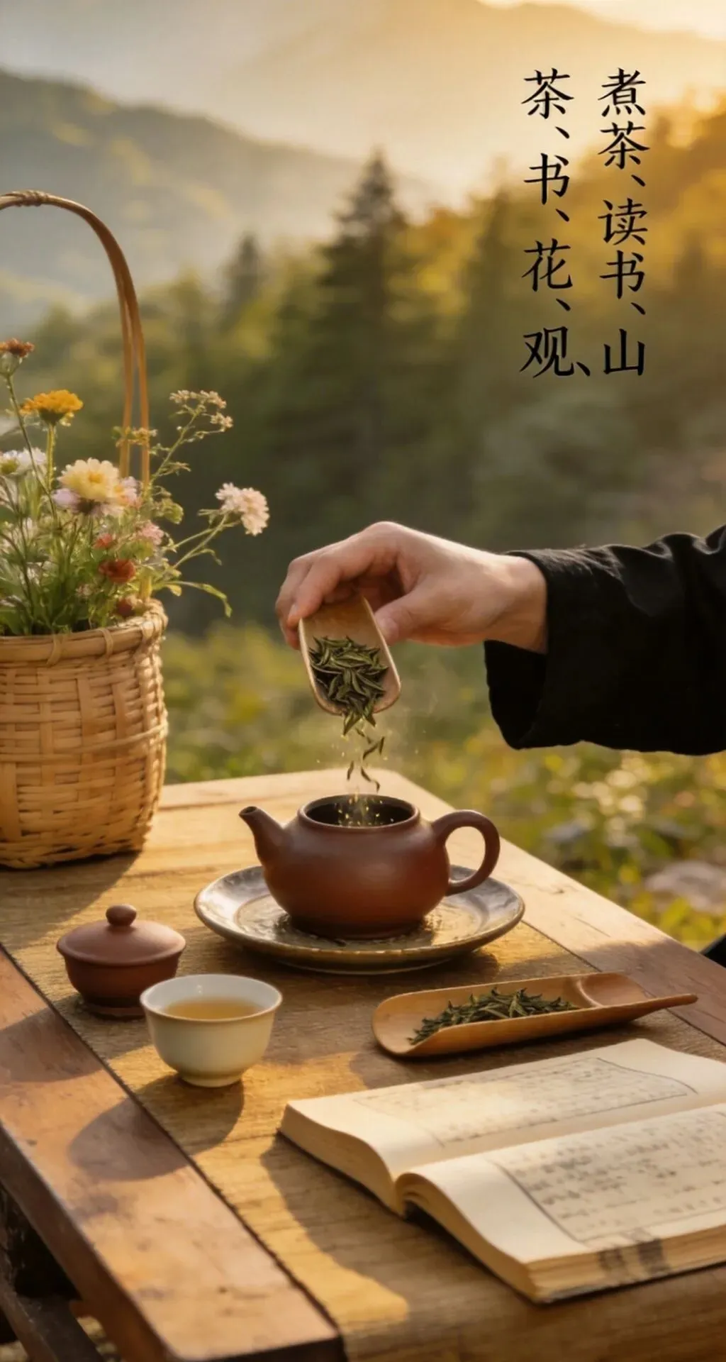竹篮盛枫红,山果缀清欢,紫砂煮春露,素盏漾云澜。左畔松风入怀,右畔溪声绕案,一卷诗书藏山河,半盏清茶润流年。雨润花枝,茶烟漫卷,于林间案上,偷得浮生半日闲,把寻常日子,熬成了诗与远方的温柔。