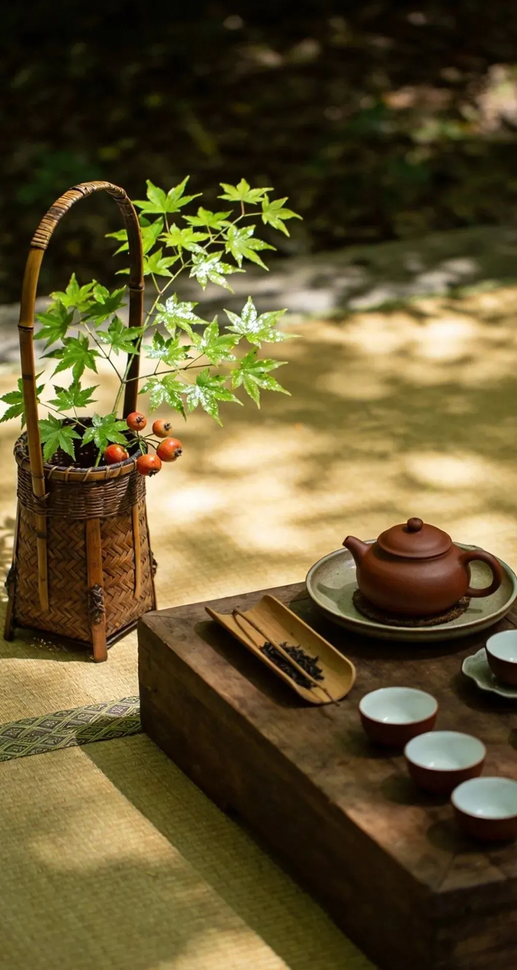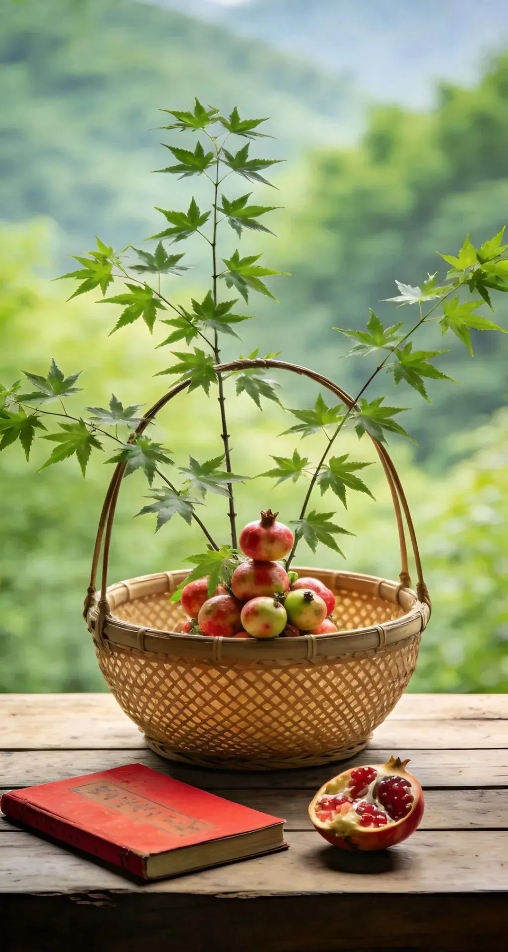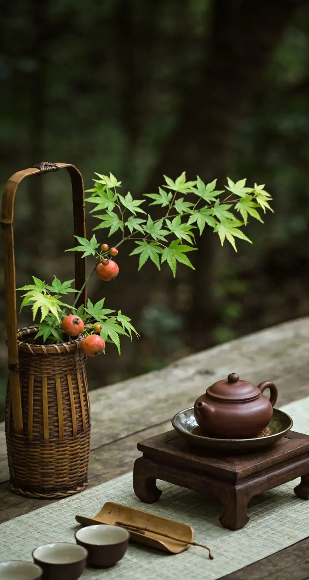 竹篮盛枫红,山果缀清欢,紫砂煮春露,素盏漾云澜。左畔松风入怀,右畔溪声绕案,一卷诗书藏山河,半盏清茶润流年。雨润花枝,茶烟漫卷,于林间案上,偷得浮生半日闲,把寻常日子,熬成了诗与远方的温柔。