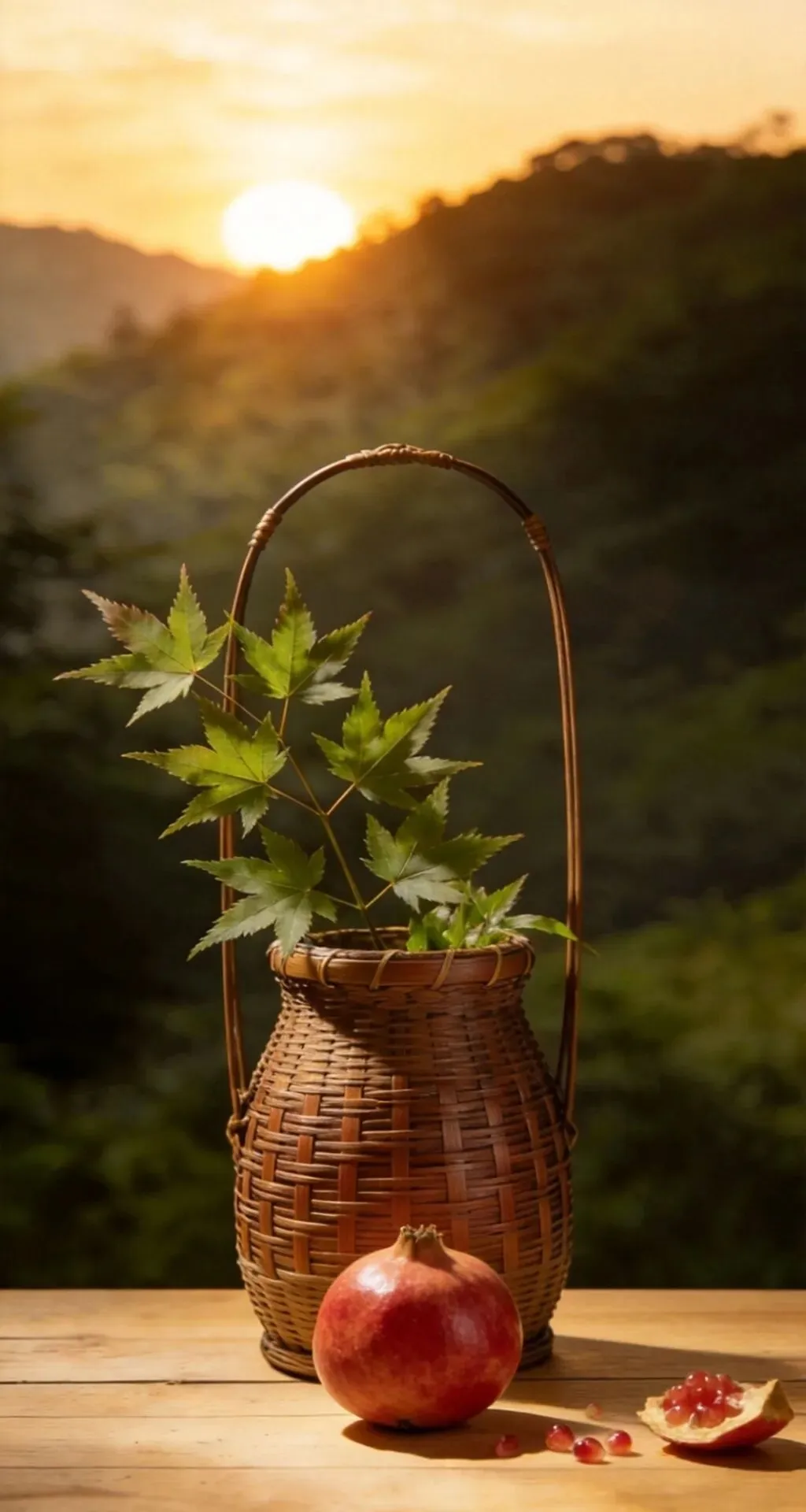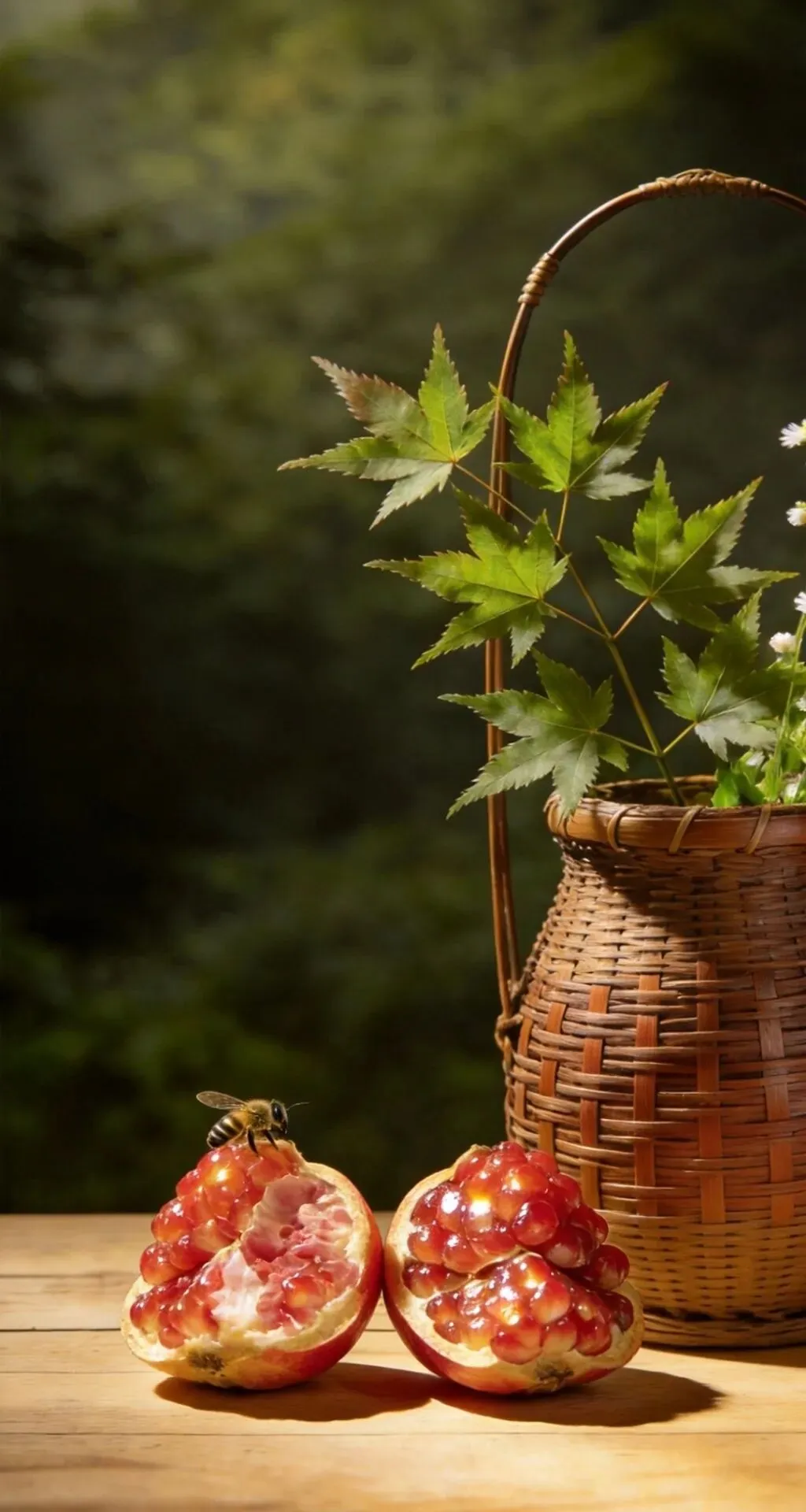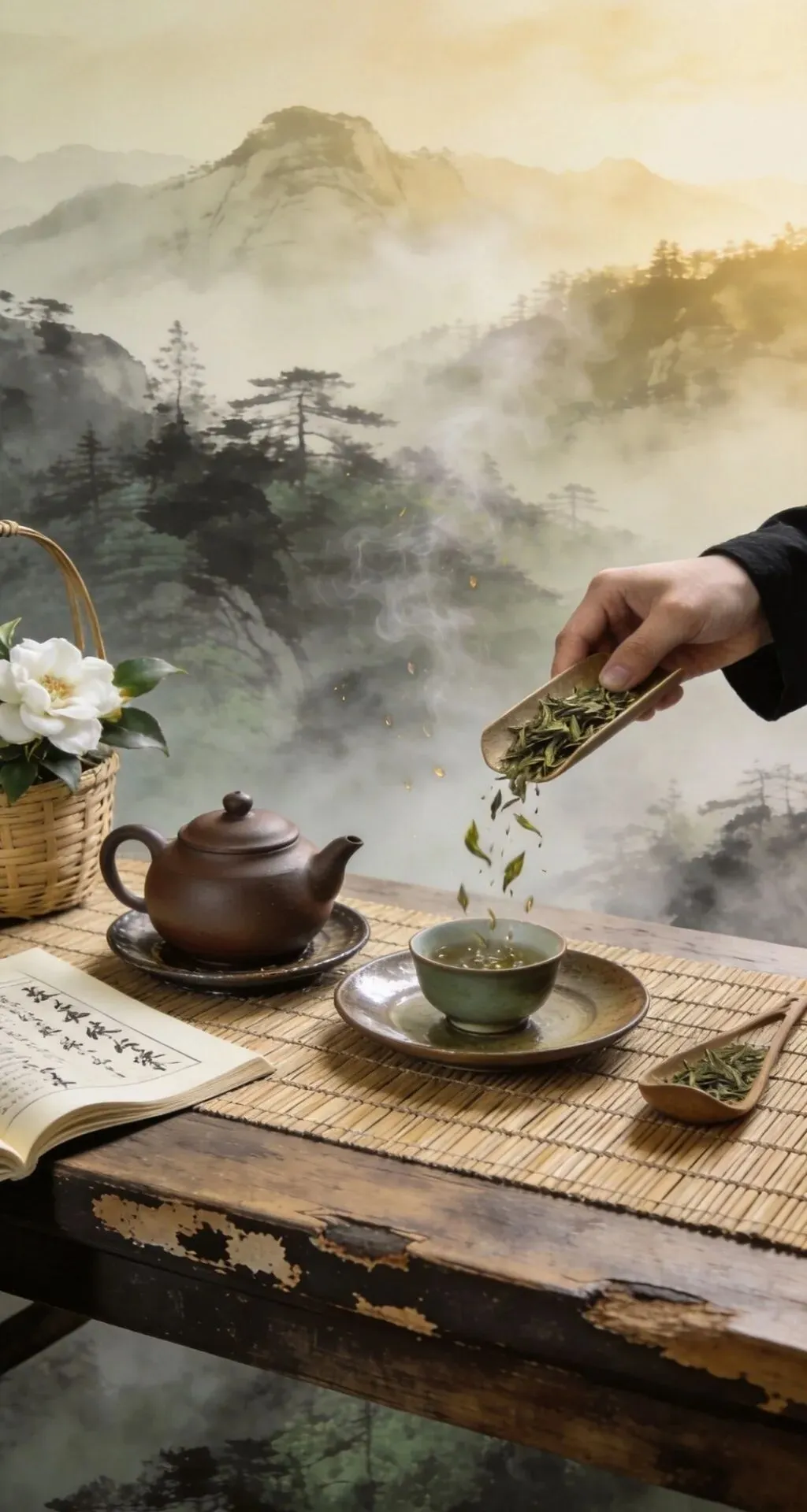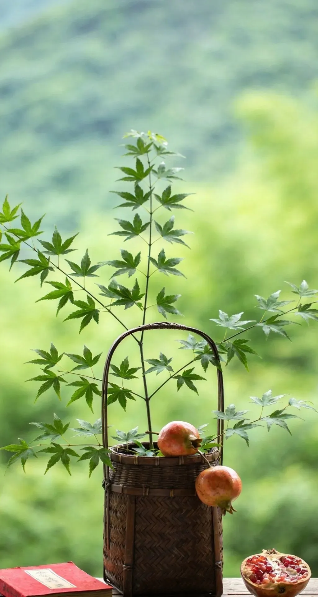 竹篮盛枫红,山果缀清欢,紫砂煮春露,素盏漾云澜。左畔松风入怀,右畔溪声绕案,一卷诗书藏山河,半盏清茶润流年。雨润花枝,茶烟漫卷,于林间案上,偷得浮生半日闲,把寻常日子,熬成了诗与远方的温柔。