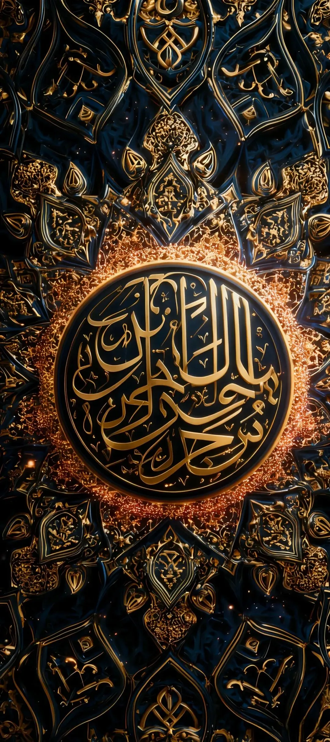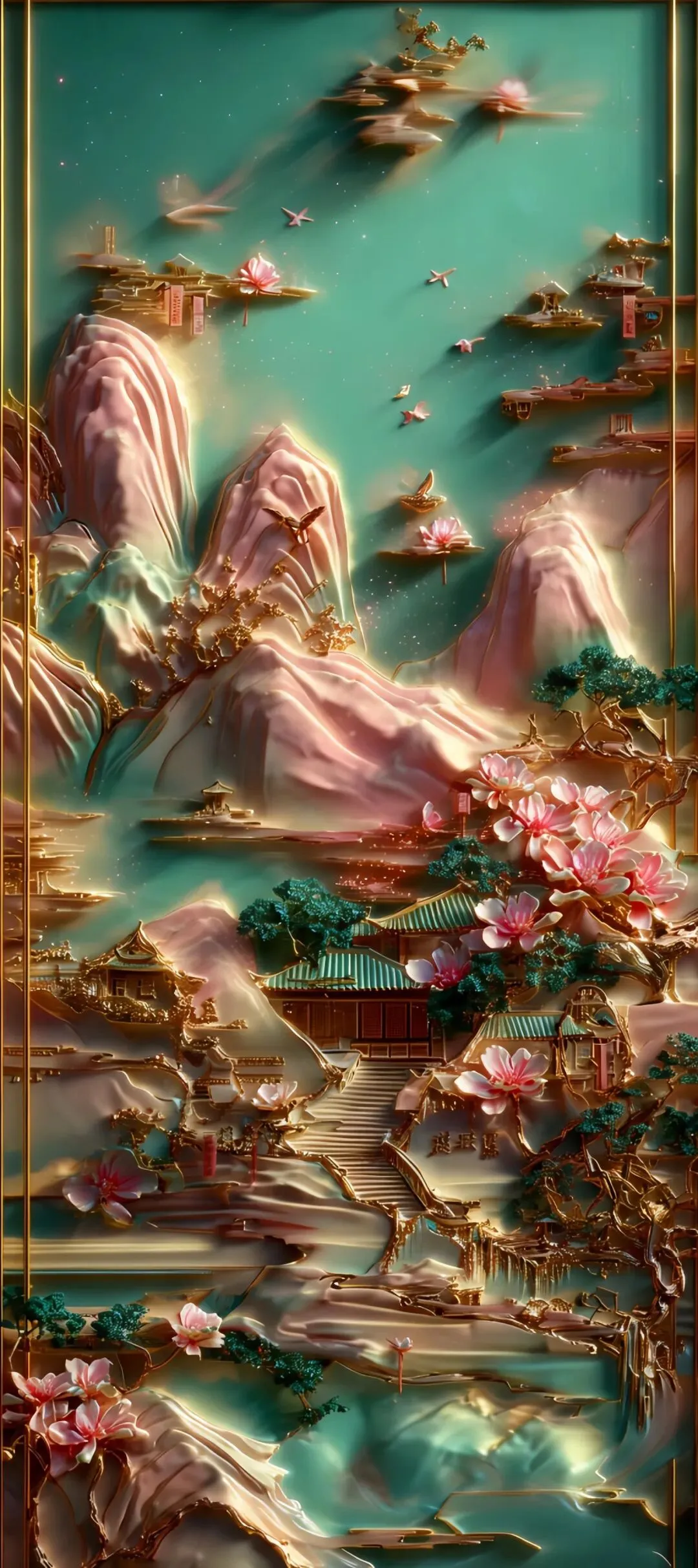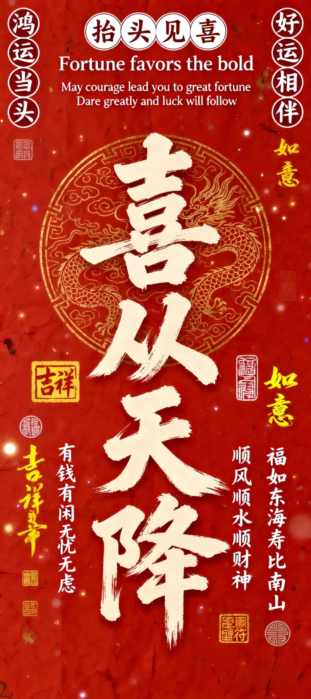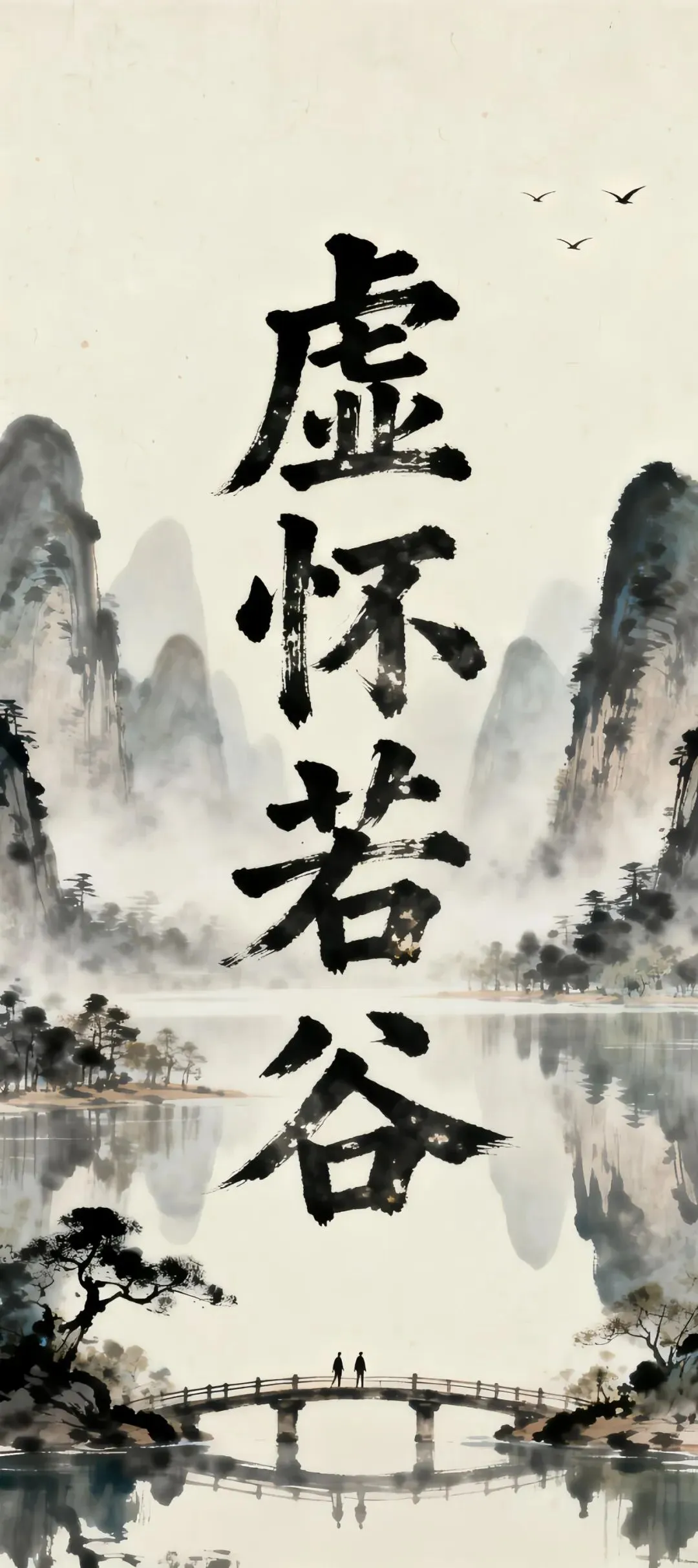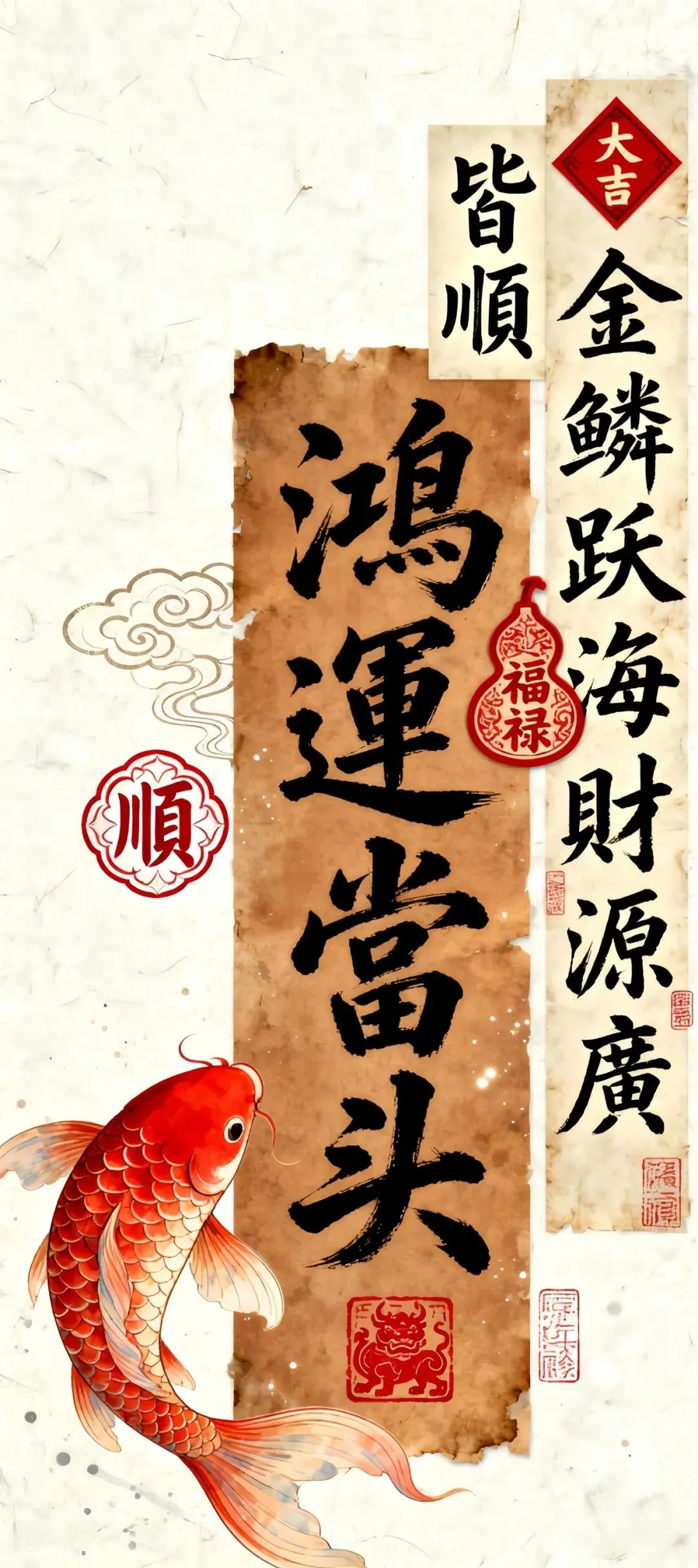 多元风格手机壁纸:黑金花纹、古铜钱波光、龙纹红底、水墨山峦与虚怀若谷