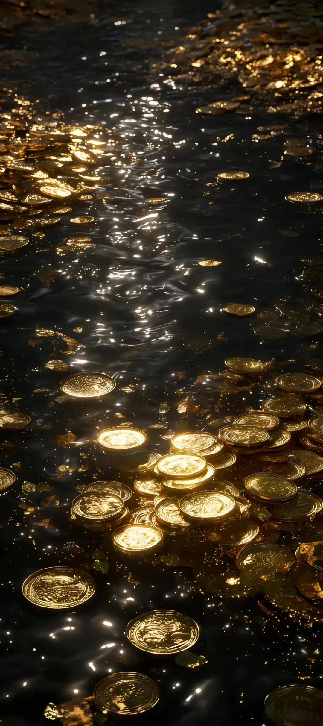 >多元风格手机壁纸:黑金花纹、古铜钱波光、龙纹红底、水墨山峦与虚怀若谷