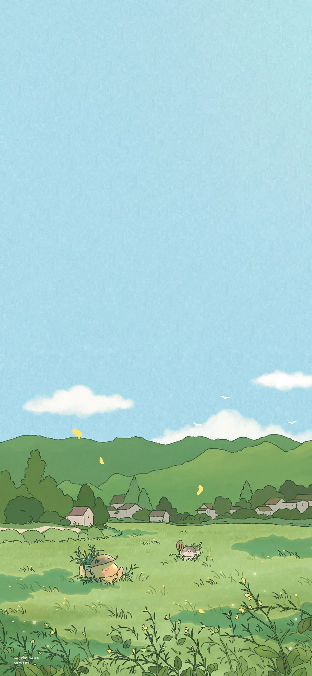 猫与绿色旷野插画手机壁纸