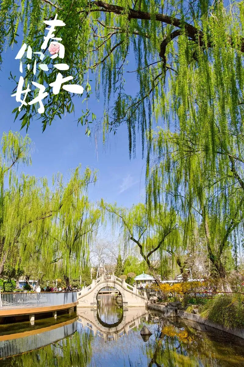 石景山雕塑公园里,小桥流水,垂柳依依。石桥下的波光与岸边的雕塑,构成了一幅流动的春日小品。